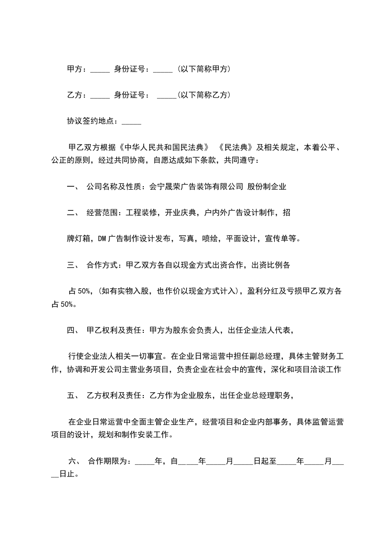 9、 由双方共同设立银行帐号——————————————,因本协议广告位所取得的一切利润先打入该共同帐号,在扣除成本后由双方按出资比例分配,每半年结算一次,于每年__________月__________日及__________月__________日进行结算。该帐号内资金双方必须共同签字领取,如任意一方私自在该帐号内取款,除必须返还外,另行支付对方私自提取金额20%的违约金
