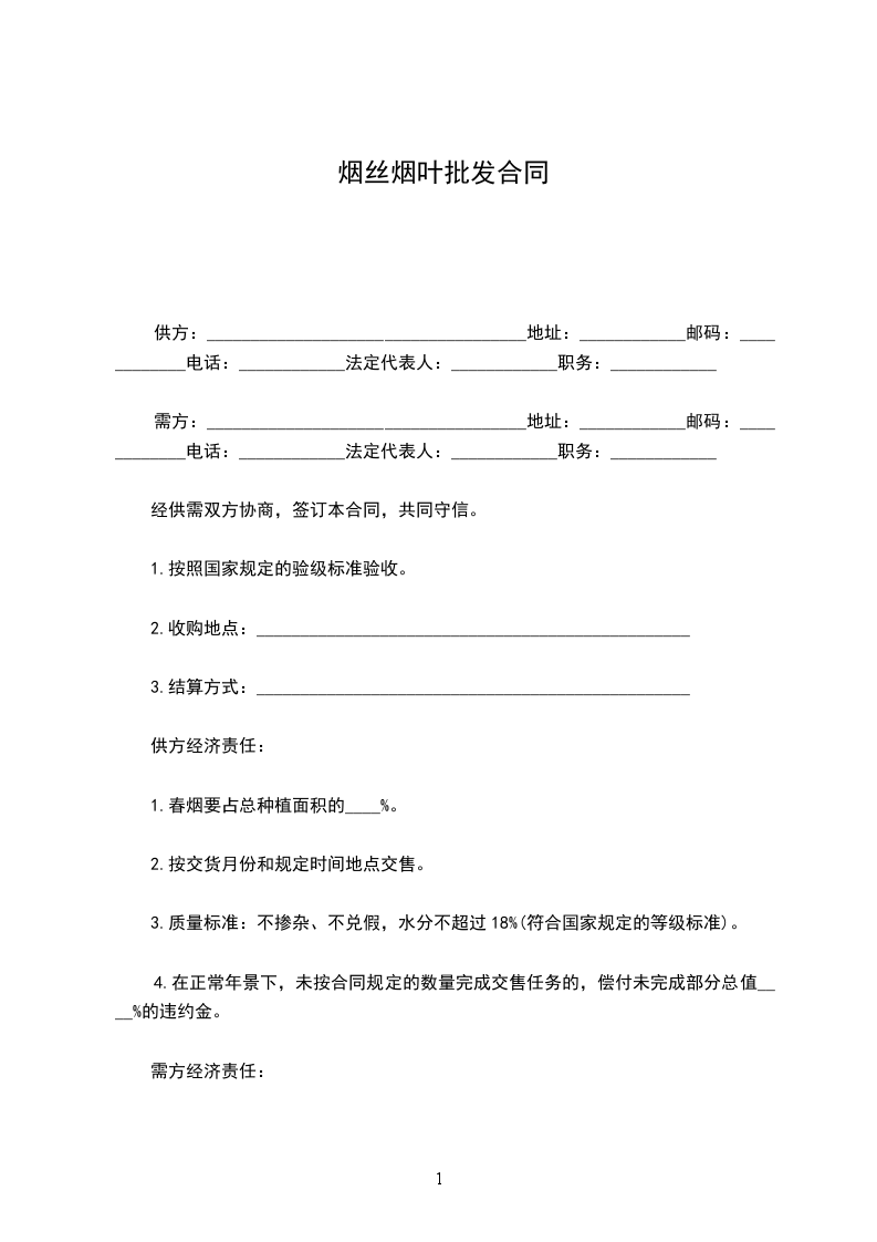 1.对交售的烟叶必须按国家规定的等级和价格标准按质论价,付给供方货款,不得压级压价;如有压级压价,除还足压价部分货款外,应按压价总值____%偿付违约金。