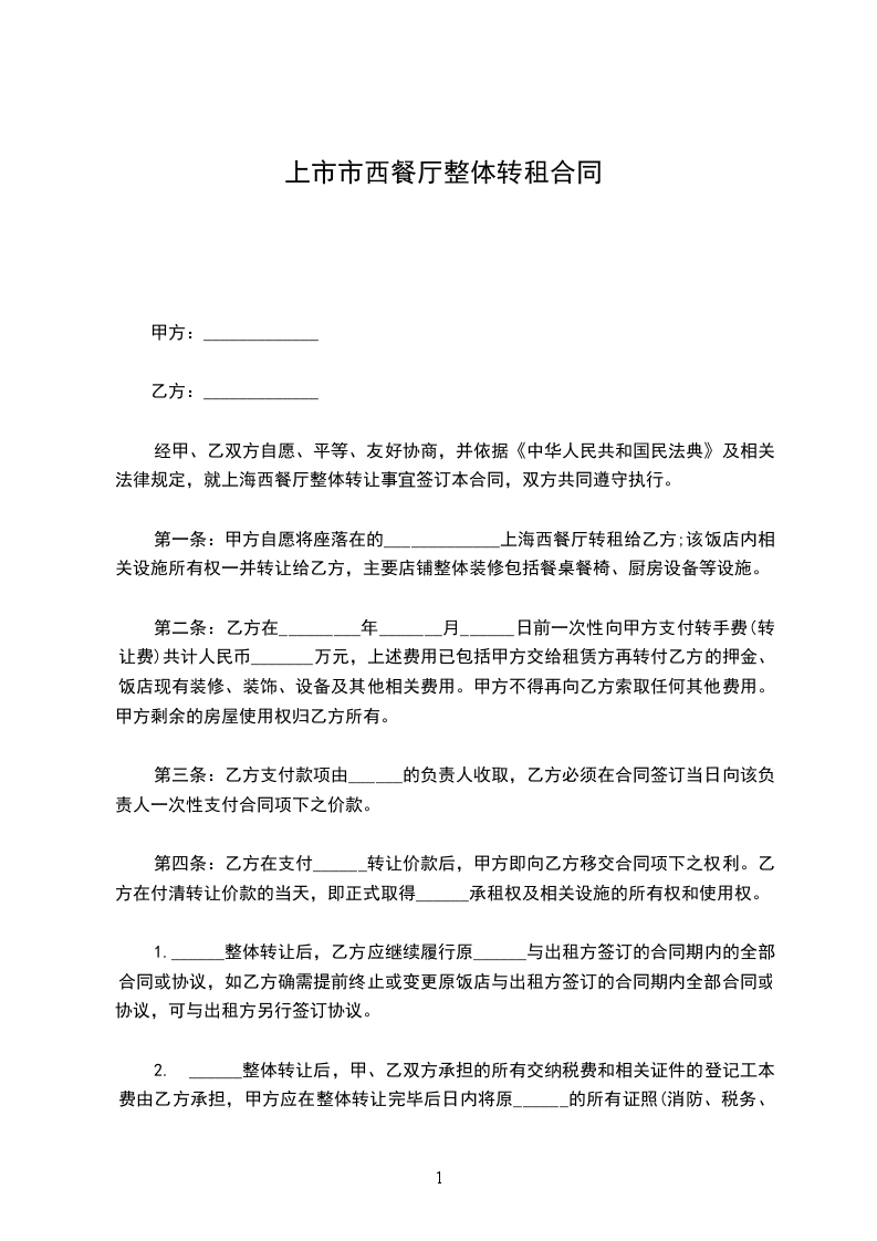 经甲、乙双方自愿、平等、友好协商,并依据《中华人民共和国民法典》及相关法律规定,就上海西餐厅整体转让事宜签订本合同,双方共同遵守执行。