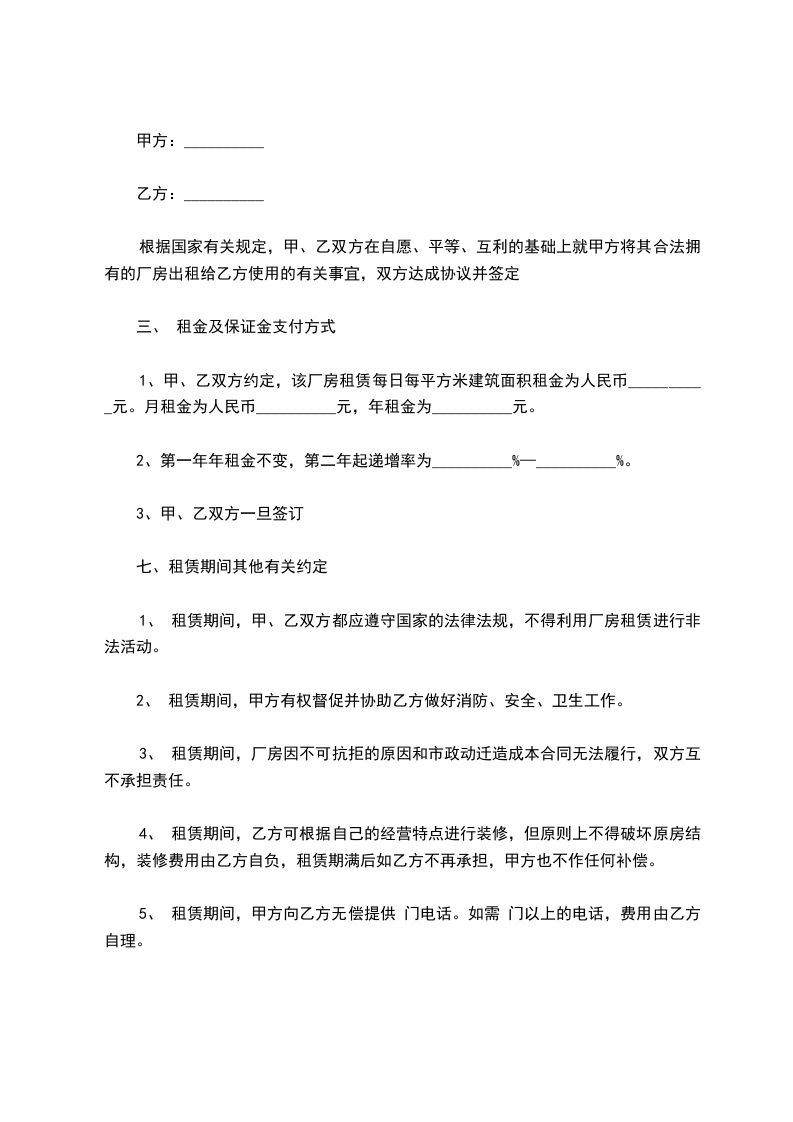 1、 租赁期间,甲、乙双方都应遵守国家的法律法规,不得利用厂房租赁进行非法活动。