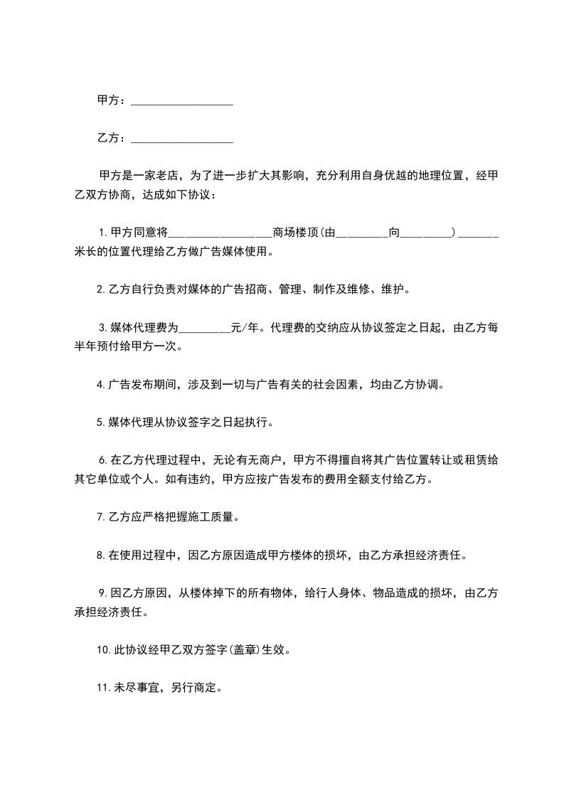 1.甲方同意将__________________商场楼顶(由_________向_________)_______米长的位置代理给乙方做广告媒体使用。