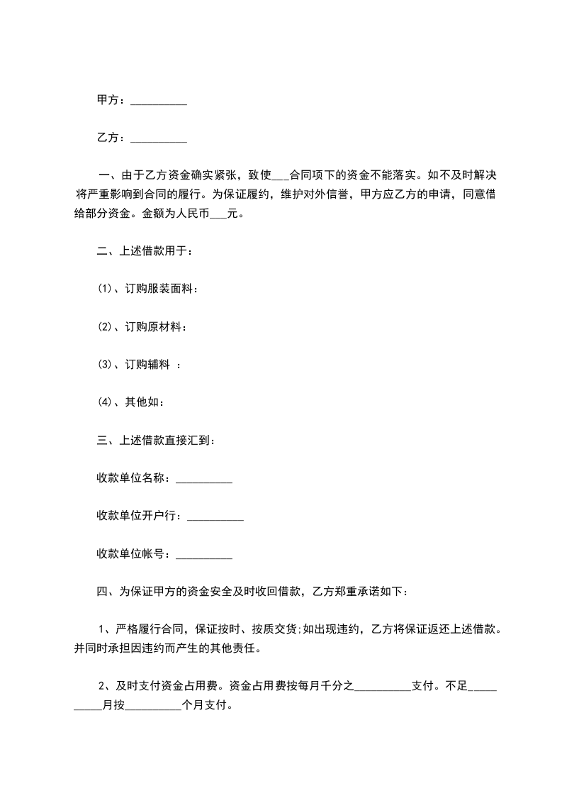 一、由于乙方资金确实紧张,致使___合同项下的资金不能落实。如不及时解决将严重影响到合同的履行。为保证履约,维护对外信誉,甲方应乙方的申请,同意借给部分资金。金额为人民币___元。