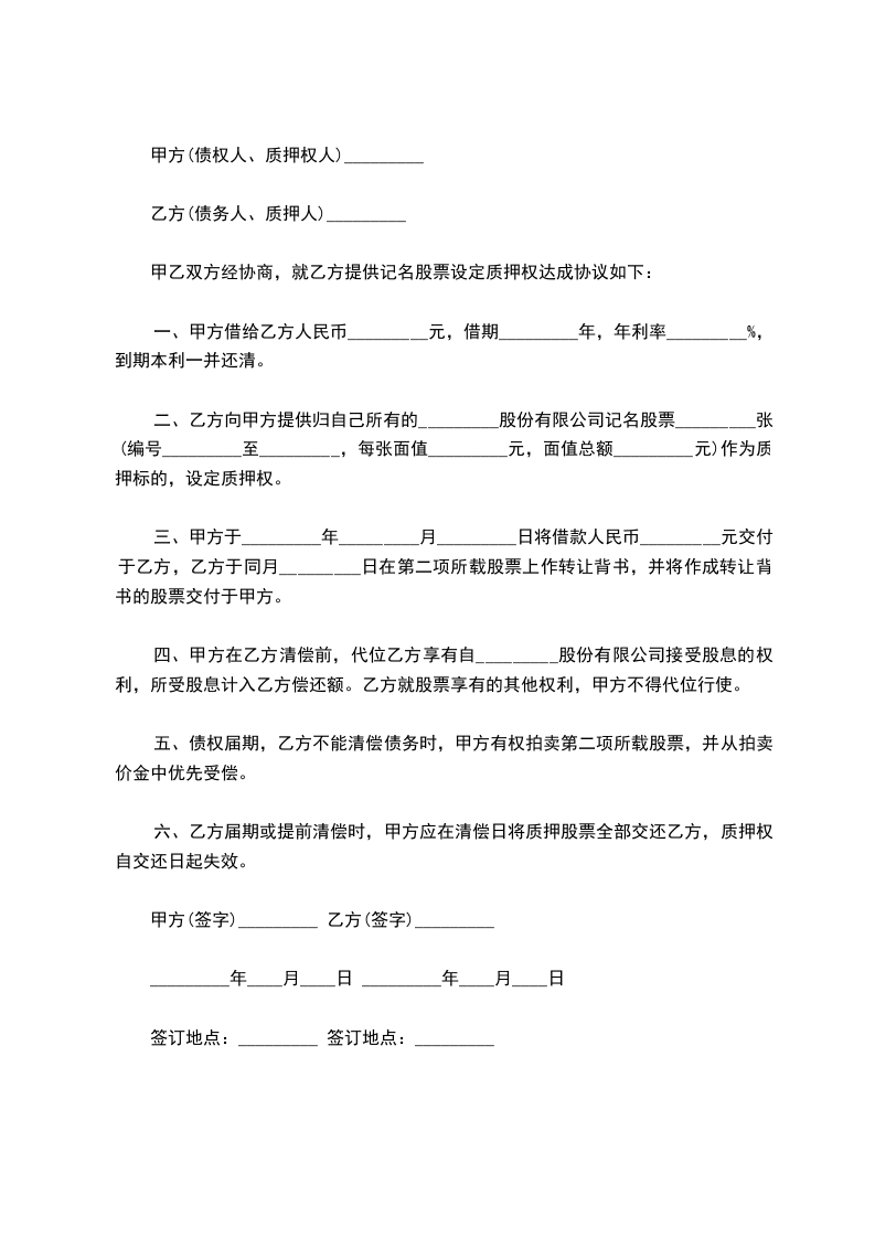 甲乙双方经协商,就乙方提供记名股票设定质押权达成协议如下: