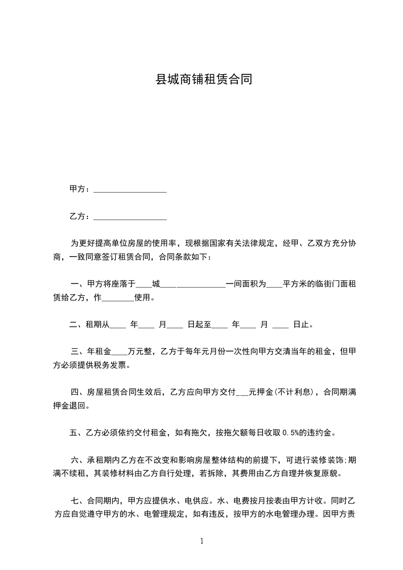一、甲方将座落于____城________________一间面积为____平方米的临街门面租赁给乙方,作________使用。