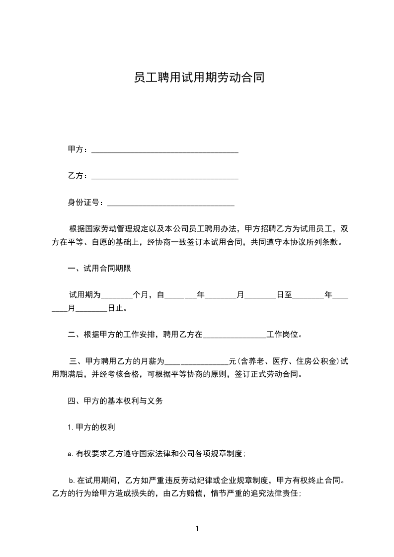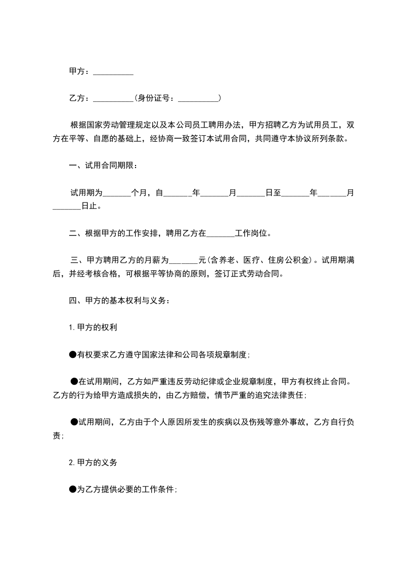 一、试用期限:自_________年______月______日起至_________年______月______日止,共计_________个月。