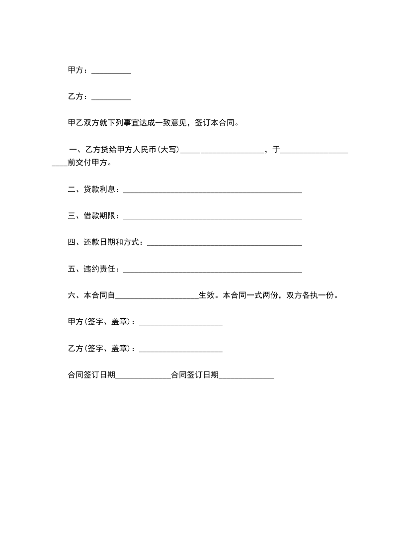 一、乙方贷给甲方人民币(大写)_____________________,于_____________________前交付甲方。
