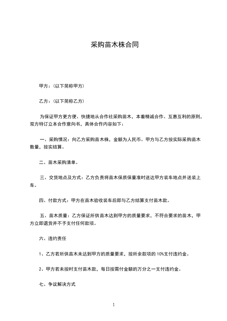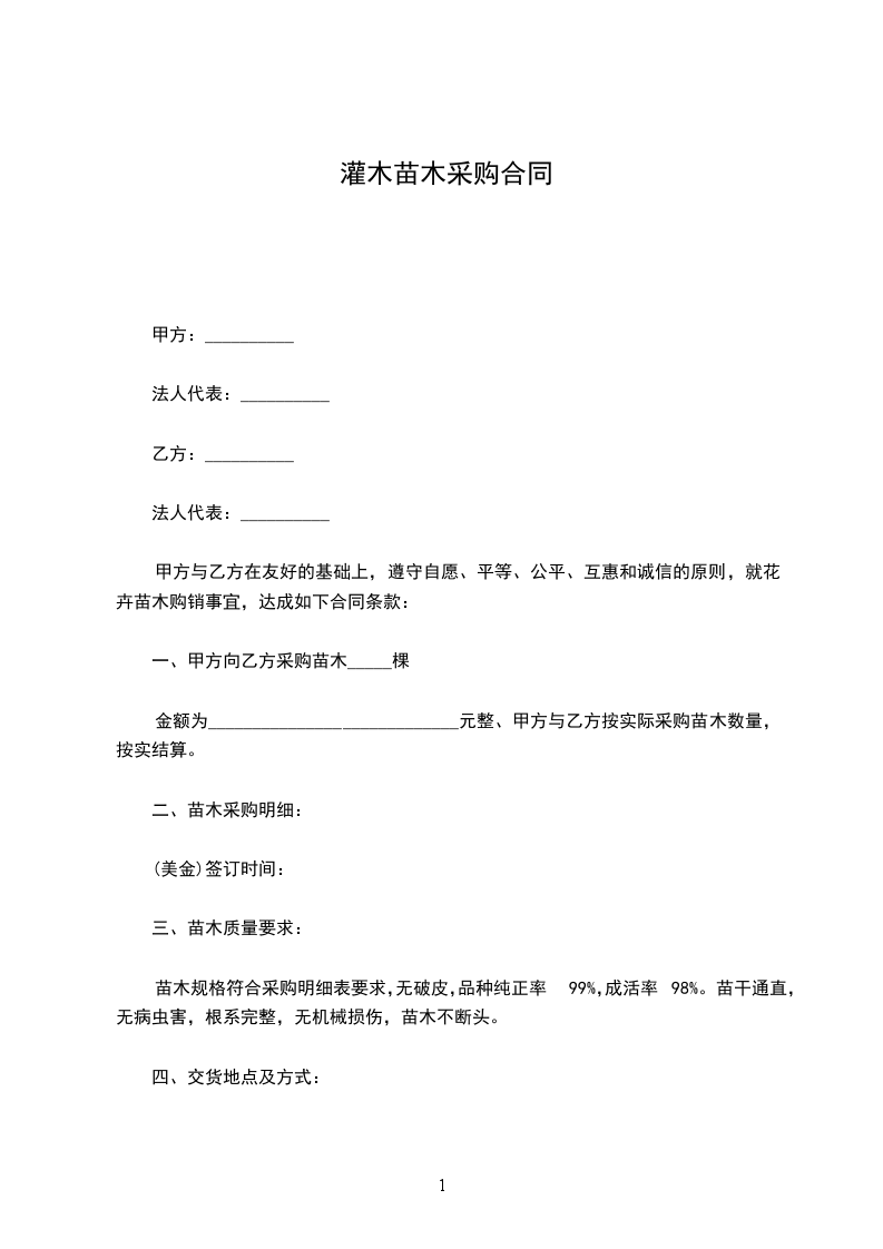 一、采购情况:向乙方采购苗木株,金额为人民币。甲方与乙方按实际采购苗木数量,按实结算。