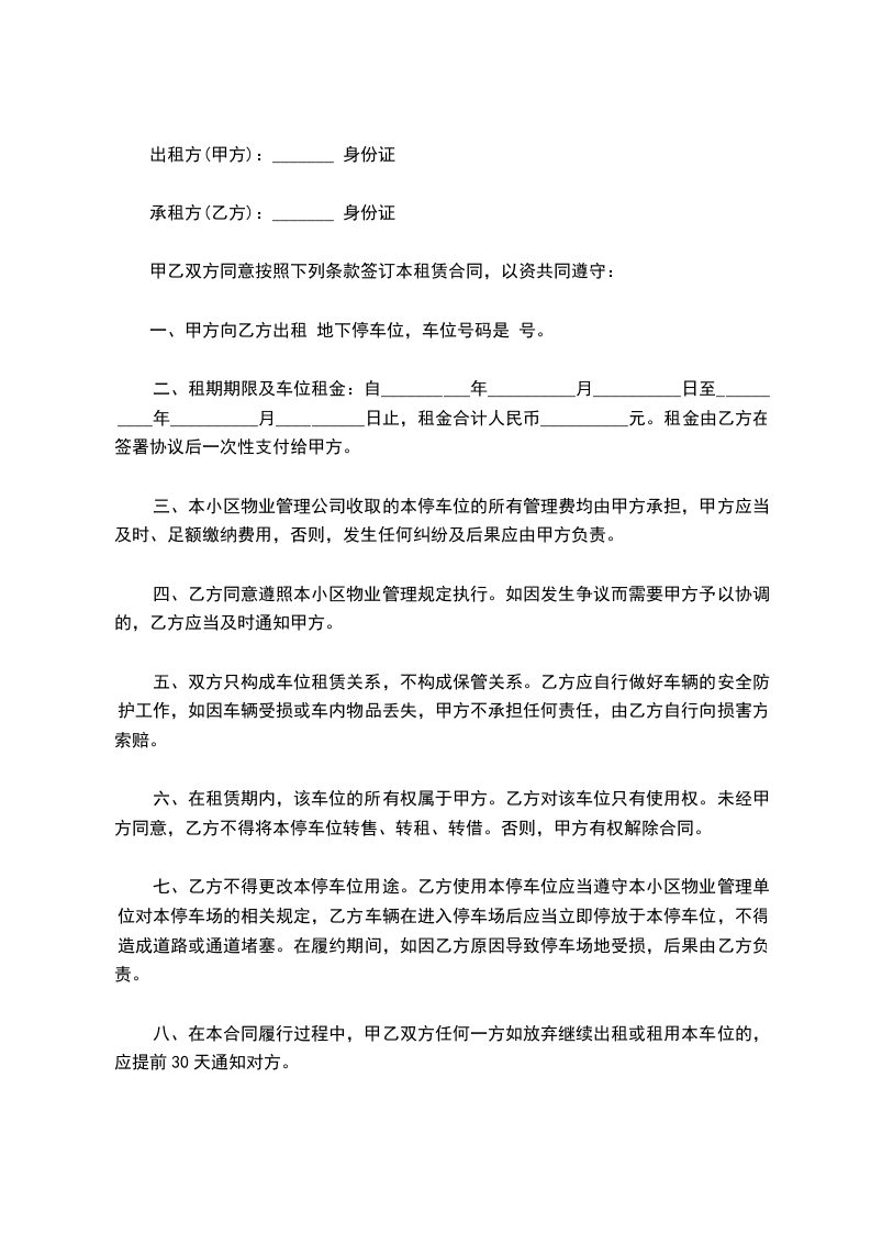 八、在本合同履行过程中,甲乙双方任何一方如放弃继续出租或租用本车位的,应提前30天通知对方。