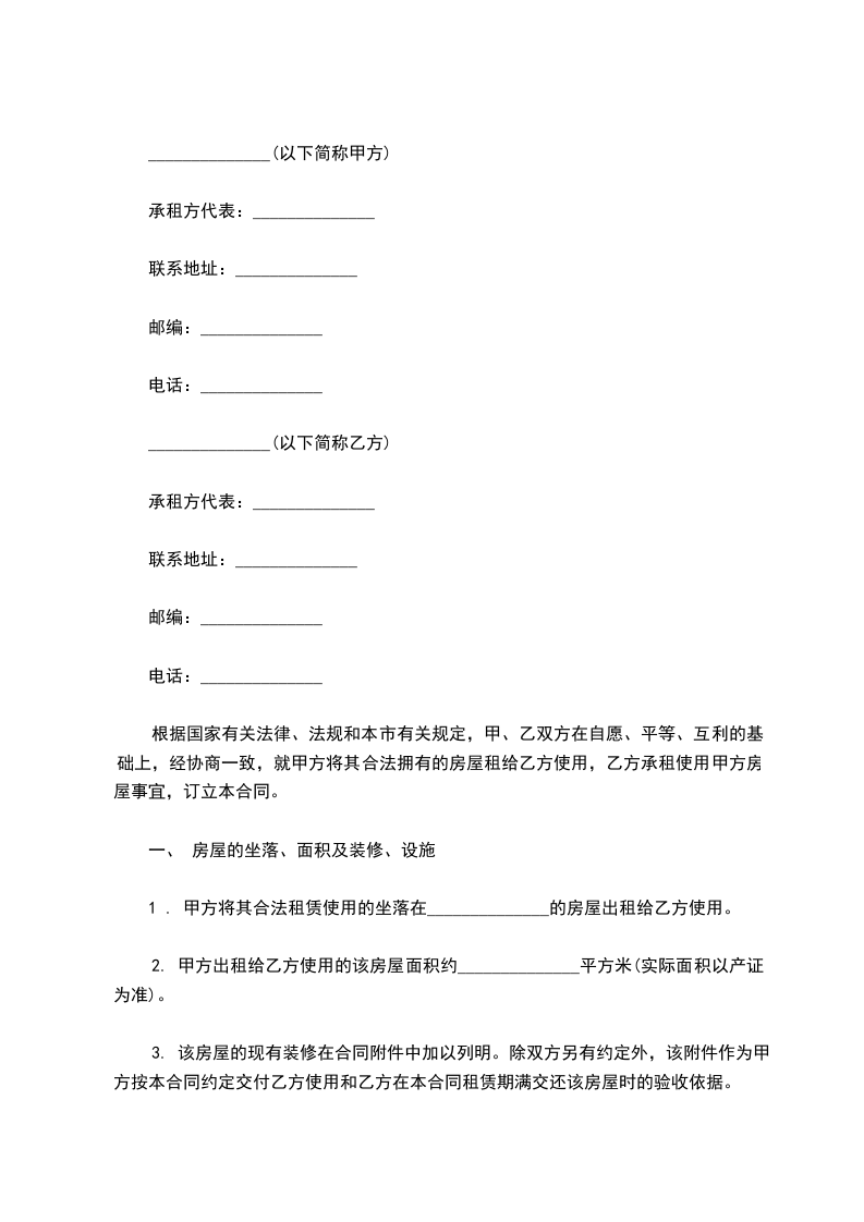 根据国家有关法律、法规和本市有关规定,甲、乙双方在自愿、平等、互利的基础上,经协商一致,就甲方将其合法拥有的房屋租给乙方使用,乙方承租使用甲方房屋事宜,订立本合同。