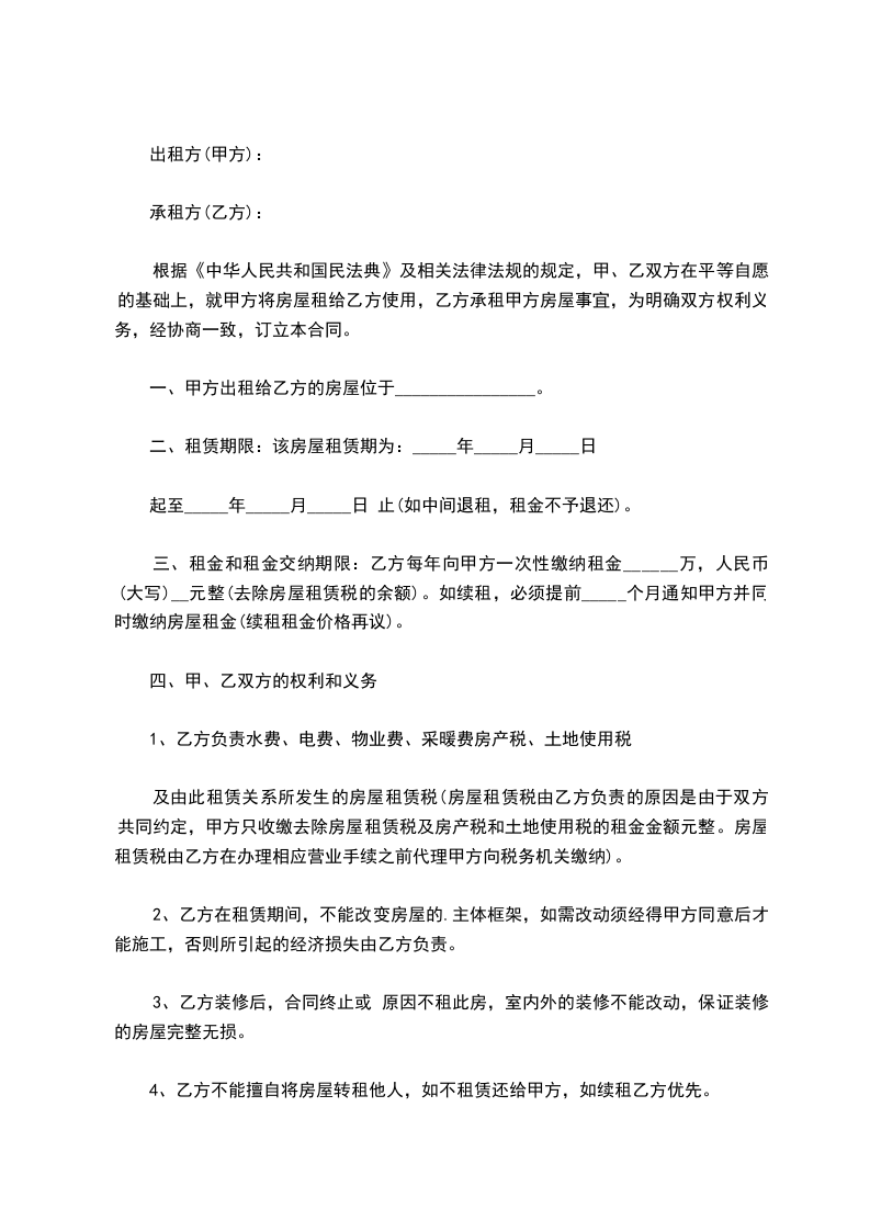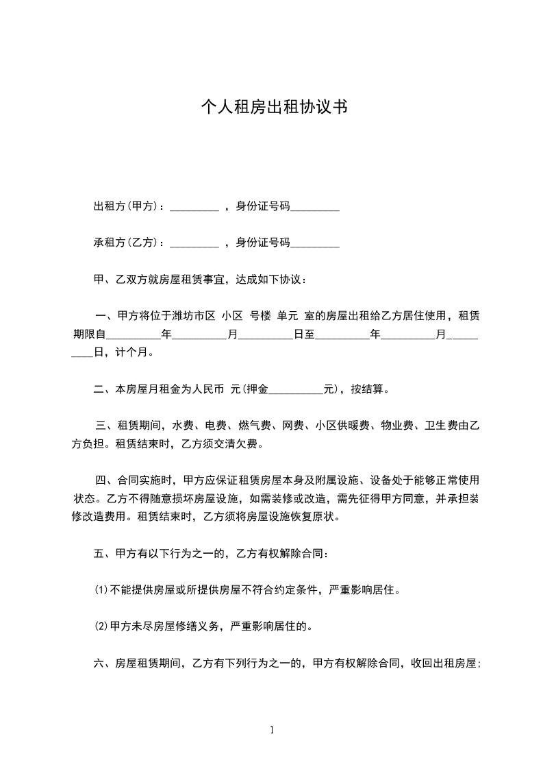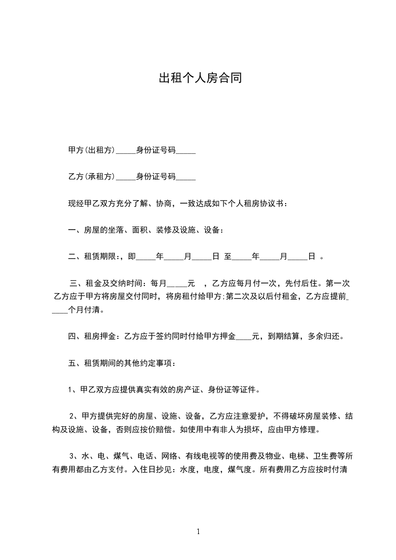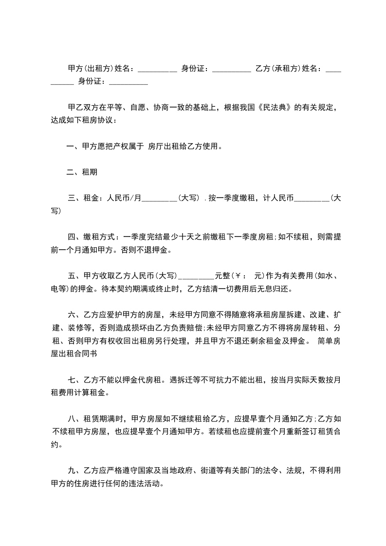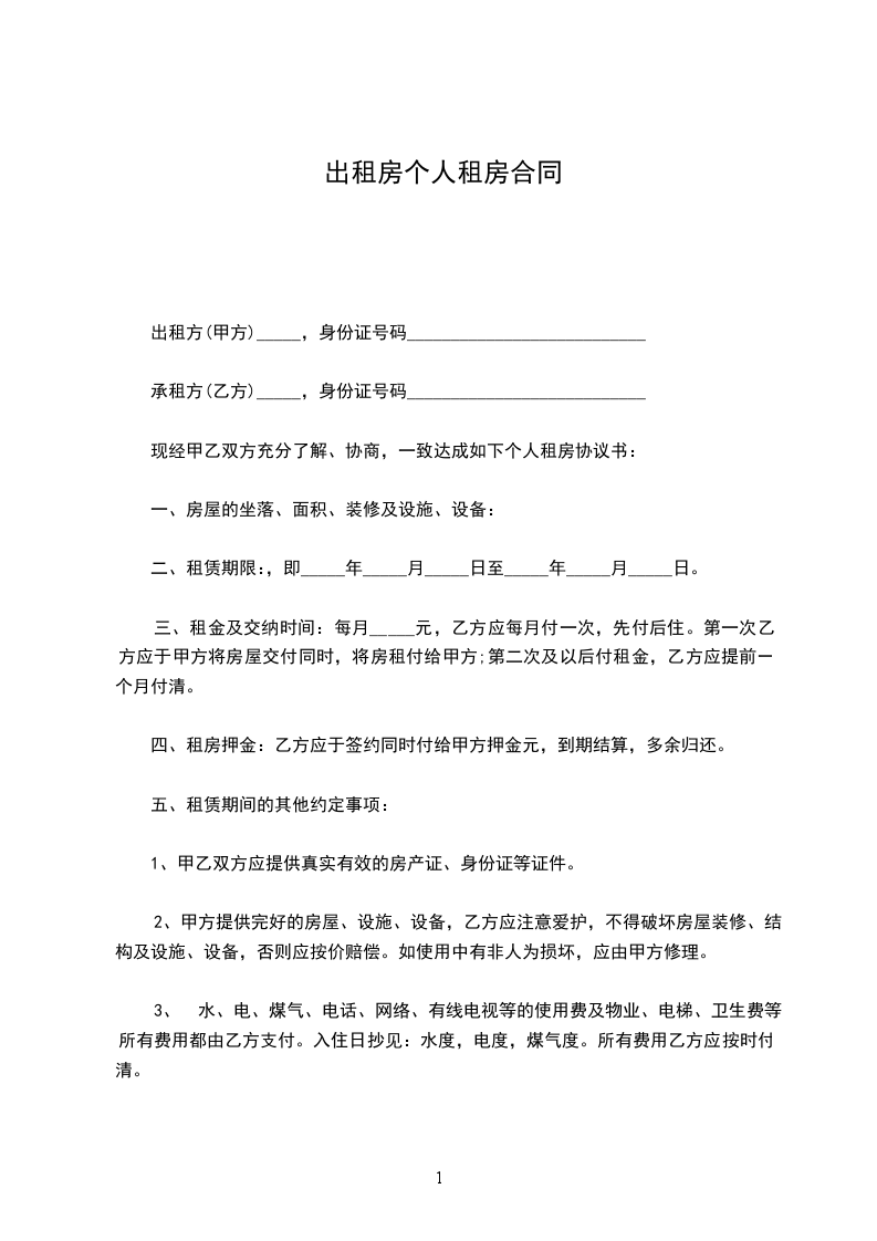 甲方(出租方)姓名:__________ 身份证:__________ 乙方(承租方)姓名:__________ 身份证:__________