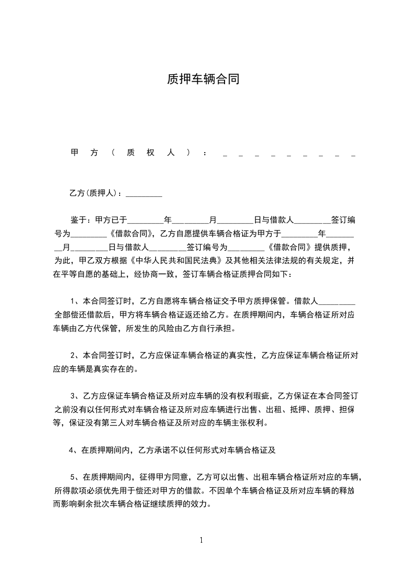 鉴于:甲方已于_________年_________月_________日与借款人_________签订编号为_________《借款合同》,乙方自愿提供车辆合格证为甲方于_________年_________月_________日与借款人_________签订编号为_________《借款合同》提供质押,为此,甲乙双方根据《中华人民共和国民法典》及其他相关法律法规的有关规定,并在平等自愿的基础上,经协商一致,签订车辆合格证质押合同如下: