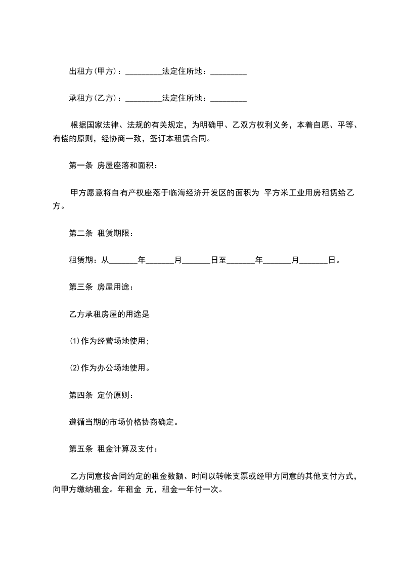 甲方愿意将自有产权座落于临海经济开发区的面积为 平方米工业用房租赁给乙方。