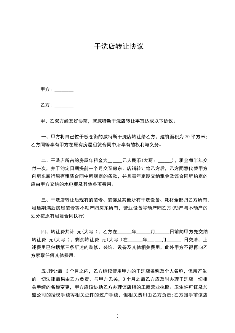 一、甲方将自己位于板仓街的威特斯干洗店转让给乙方,建筑面积为70平方米;乙方同等享有甲方在原有房屋租赁合同中所享有的权利与义务。