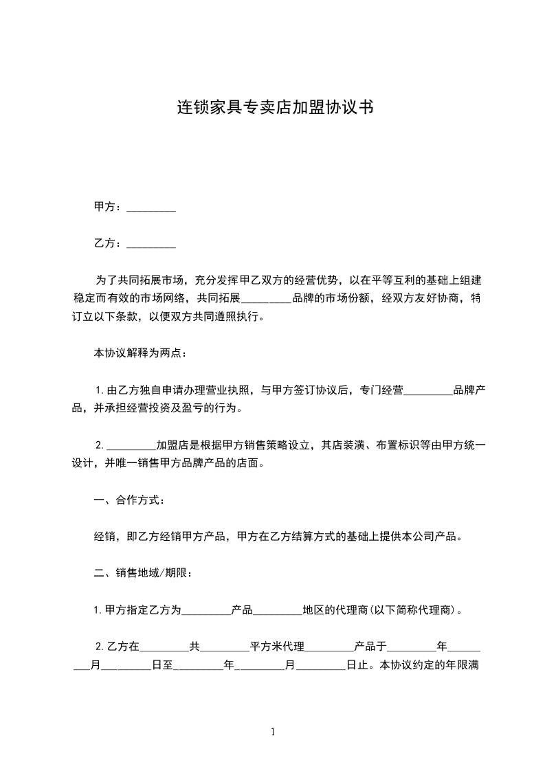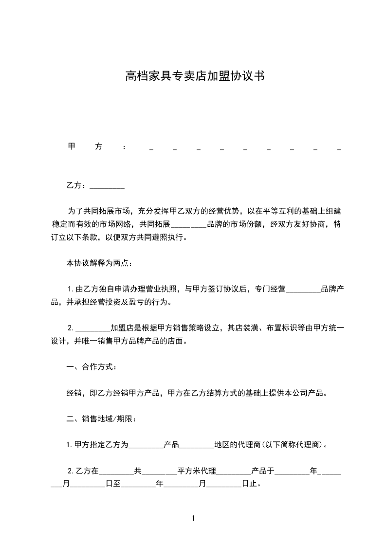 1.由乙方独自申请办理营业执照,与甲方签订协议后,专门经营 品牌产品,并承担经营投资及盈亏的行为。