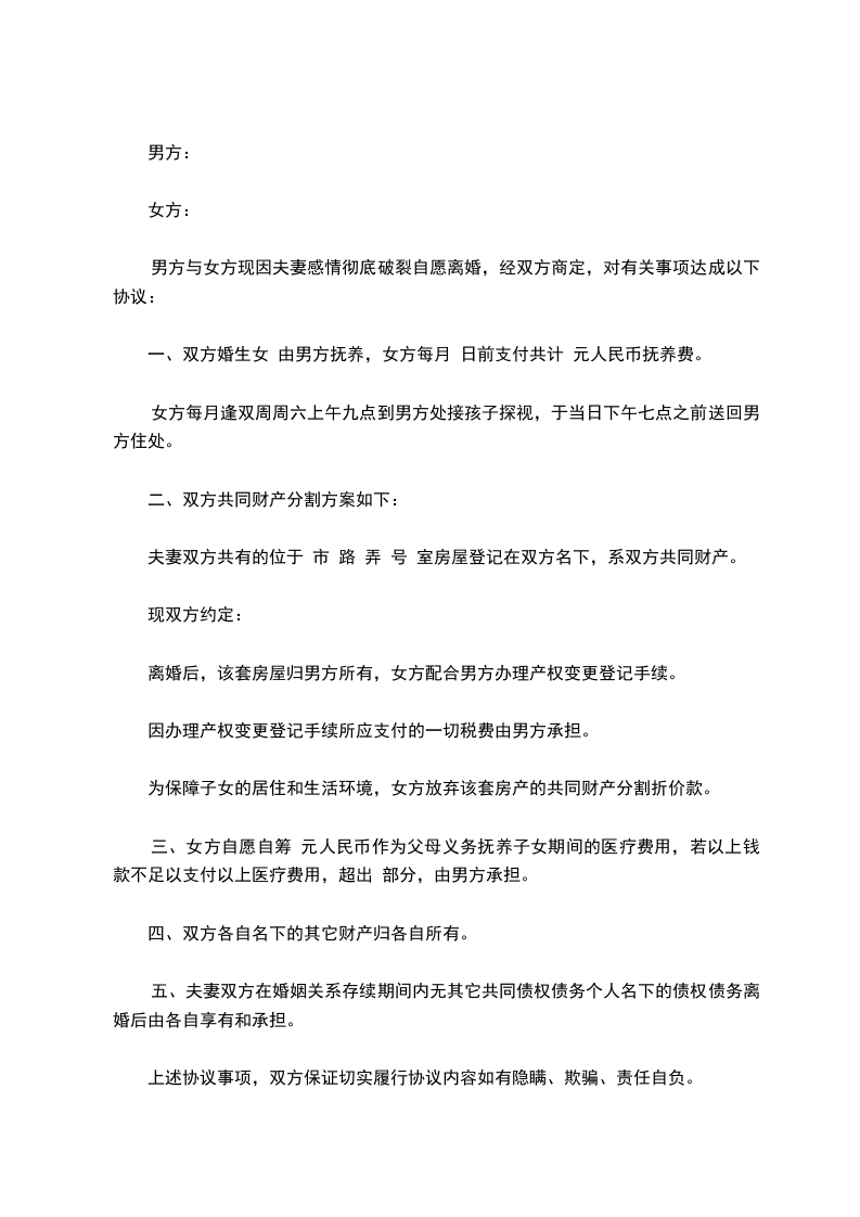 男方与女方现因夫妻感情彻底破裂自愿离婚,经双方商定,对有关事项达成以下协议: