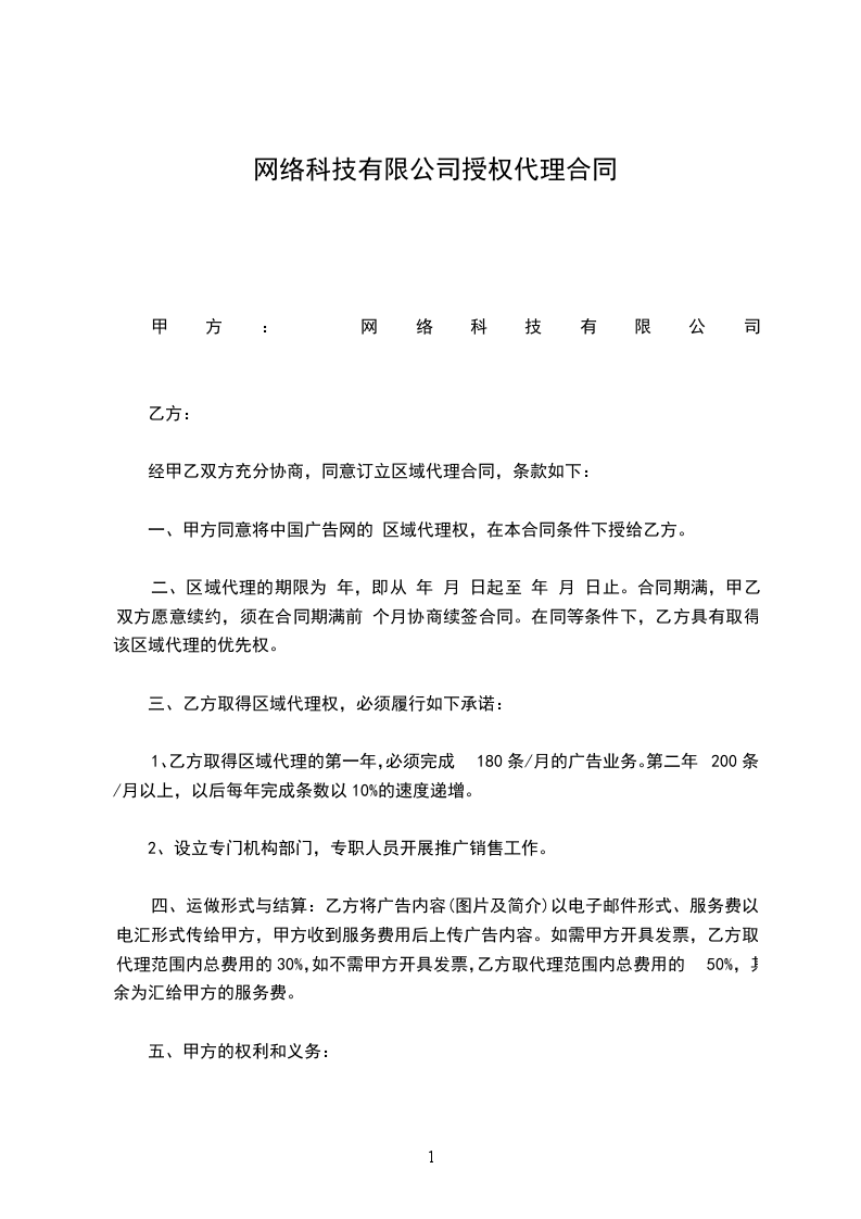 1、乙方取得区域代理的第一年,必须完成180条/月的广告业务。第二年200条/月以上,以后每年完成条数以10%的速度递增。