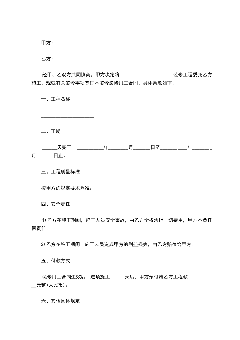 经甲、乙双方共同协商,甲方决定将______________________装修工程委托乙方施工,现就有关装修事项签订本装修装修用工合同,具体条款如下:
