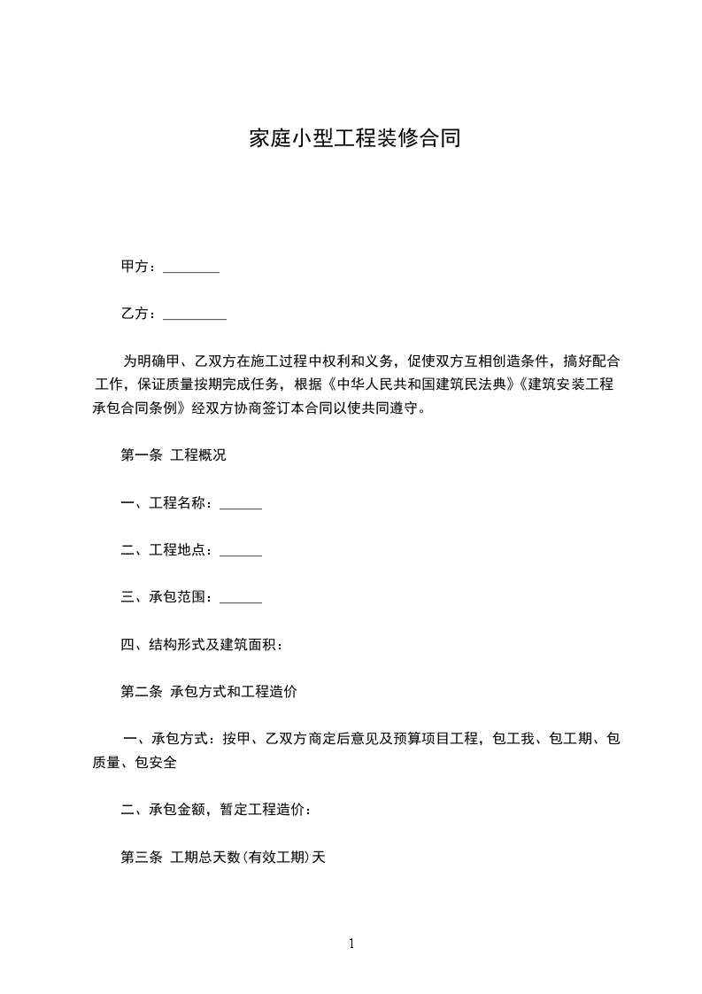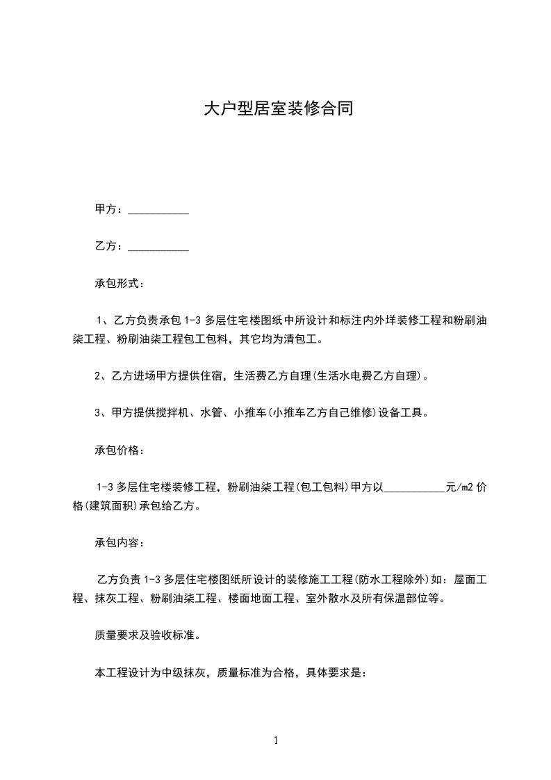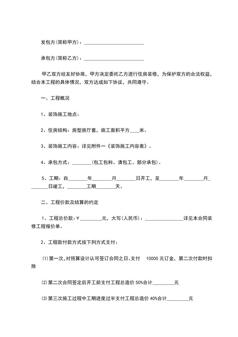 4. 承包方式:________(包工包料、清包工、部分承包)。