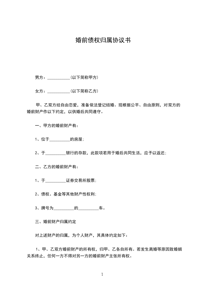 甲、乙双方经自由恋爱,准备依法登记结婚。现根据公平、自由原则,对双方的婚前财产作以下约定,以供婚后共同遵守。