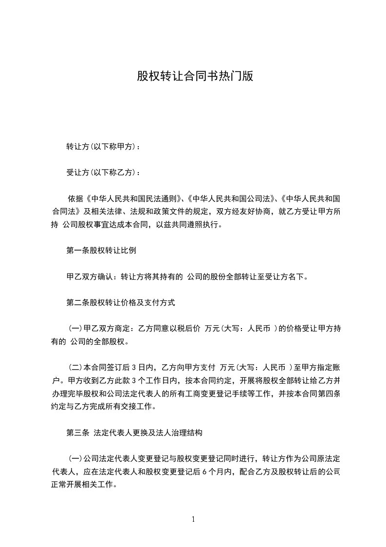 (一)甲乙双方商定:乙方同意以税后价 万元(大写:人民币 )的价格受让甲方持有的 公司的全部股权。