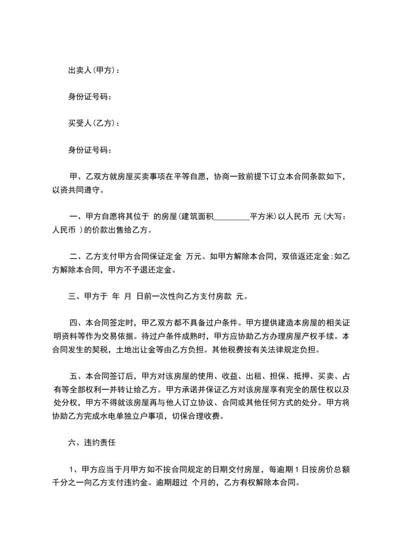 五、本合同签订后,甲方对该房屋的使用、收益、出租、担保、抵押、买卖、占有等全部权利一并转让给乙方。甲方承诺并保证乙方对该房屋享有完全的居住权以及处分权,甲方不得就该房屋再与他人订立协议、合同或其他任何方式的处分。甲方将协助乙方完成水电单独立户事项,切保合理收费。