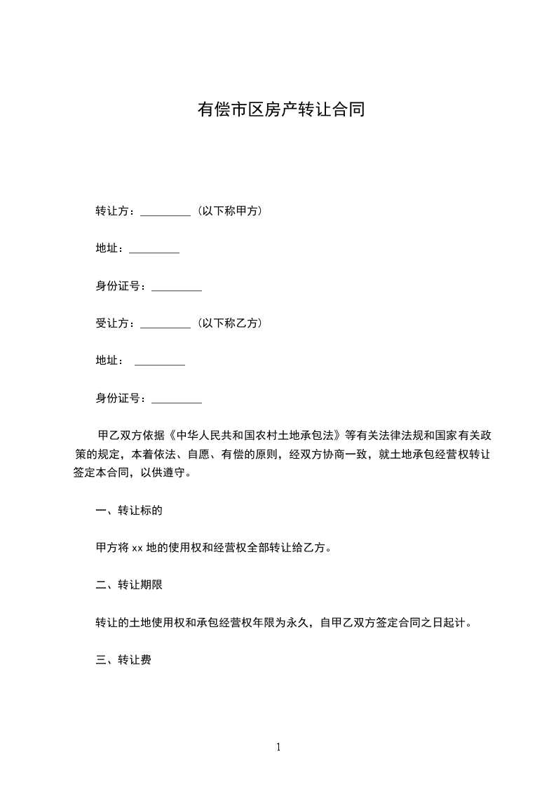 转让土地使用权和承包经营权(包括现有的所有植物)的转让金为¥_________ 元,大写_________ 。无补偿息和其他费用。