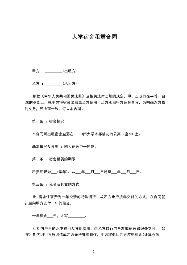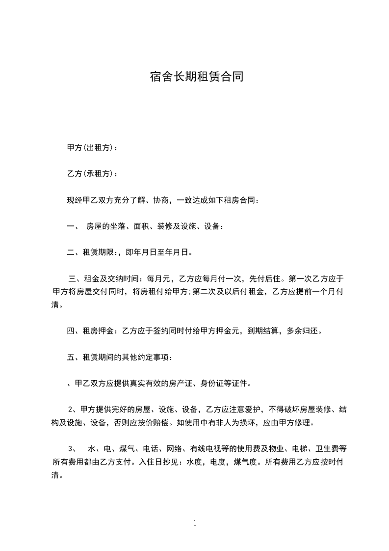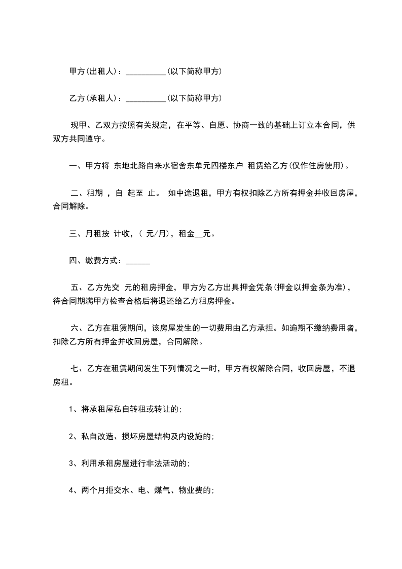 二、租期______,自______起至______止。 如中途退租,甲方有权扣除乙方所有押金并收回房屋,合同解除。