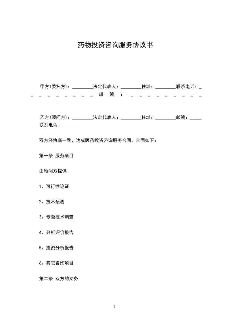 双方经协商一致,达成医药投资咨询服务合同,合同如下: