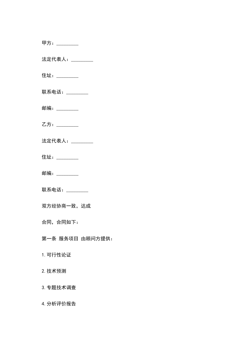 乙方(顾问方):_________法定代表人:_________住址:_________邮编:_________联系电话:_________