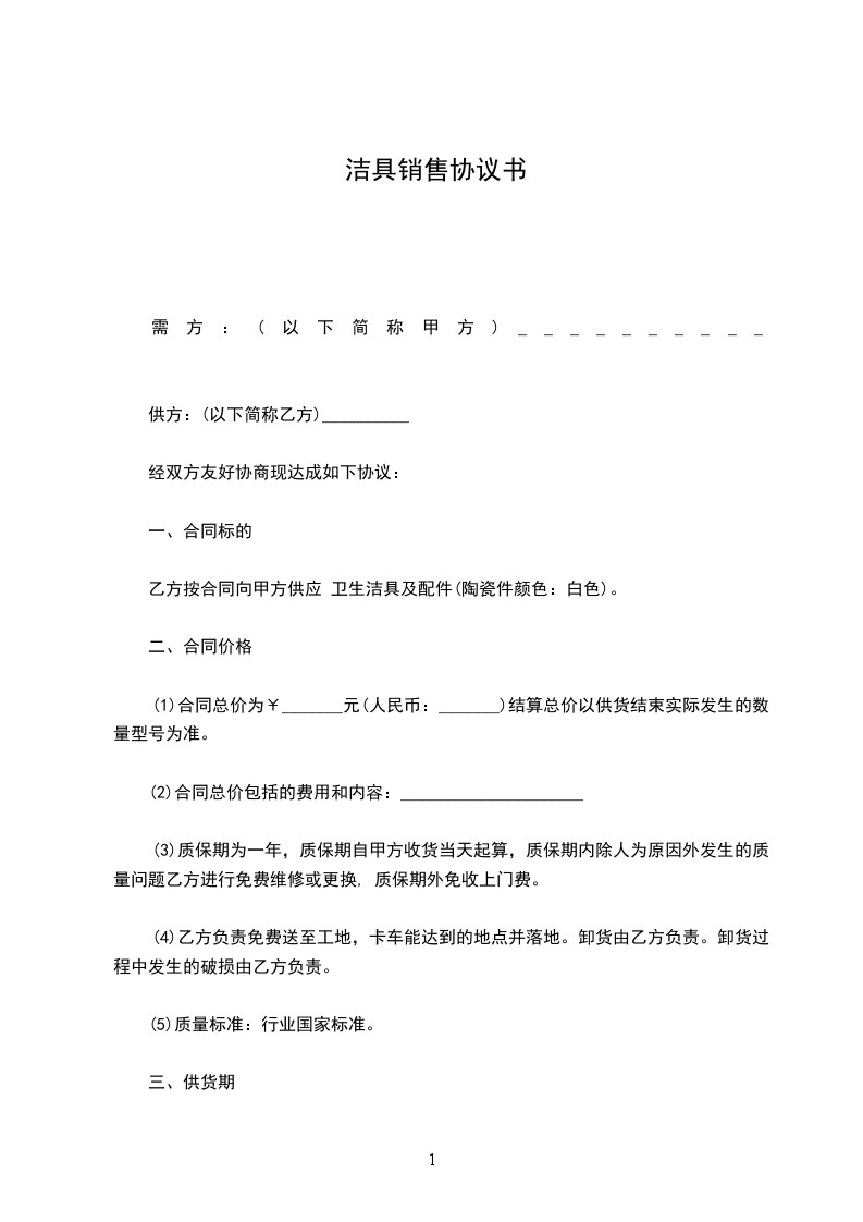 乙方按合同向甲方供应 卫生洁具及配件(陶瓷件颜色:白色)。