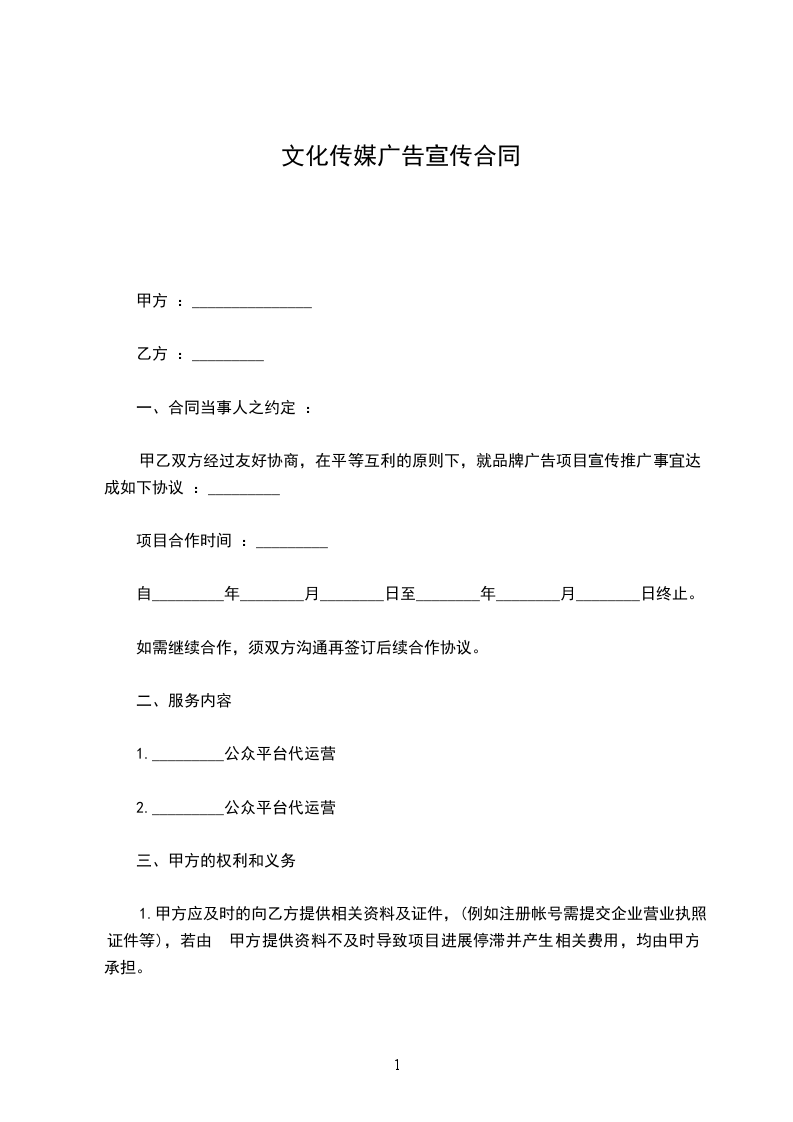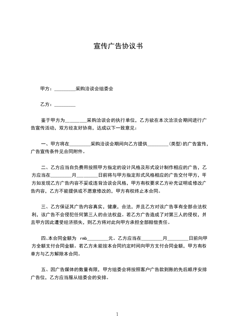 一、甲方将在_________采购洽谈会期间向乙方提供_________(类型)的广告宣传,广告宣传条件见合同附件。