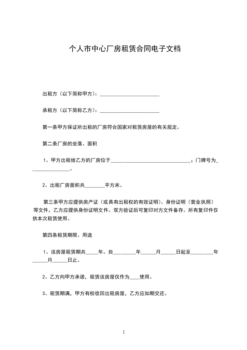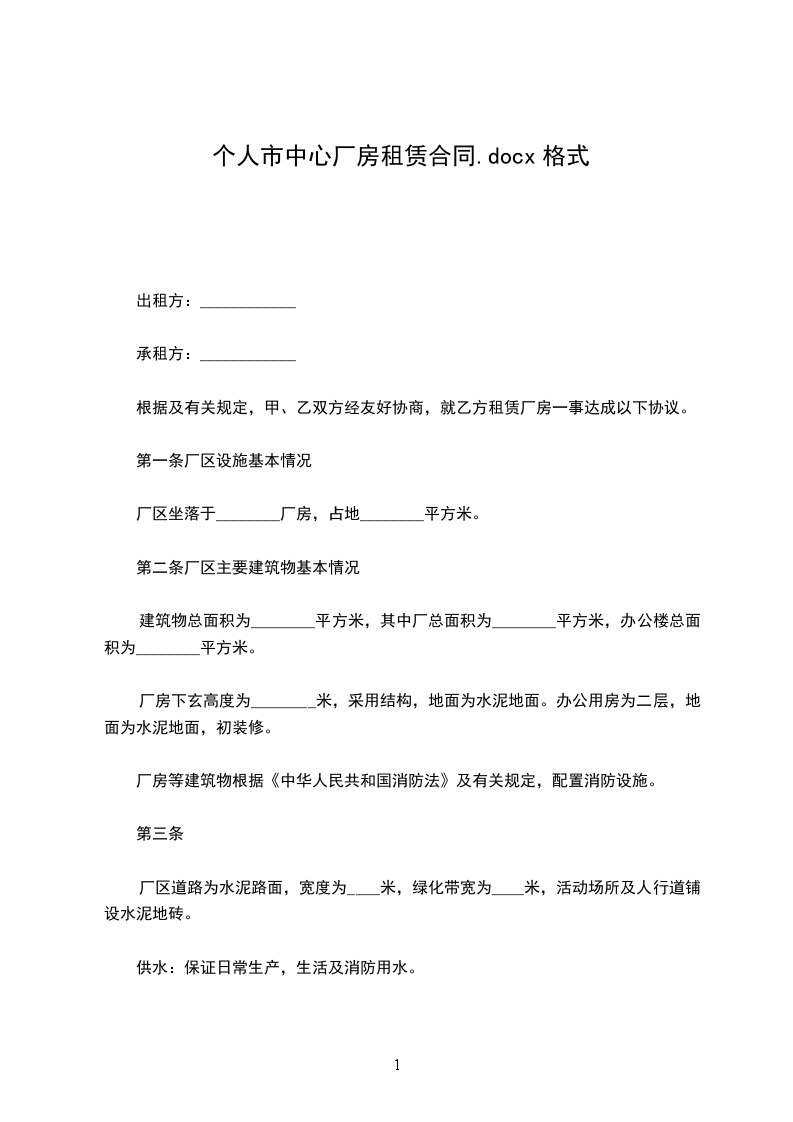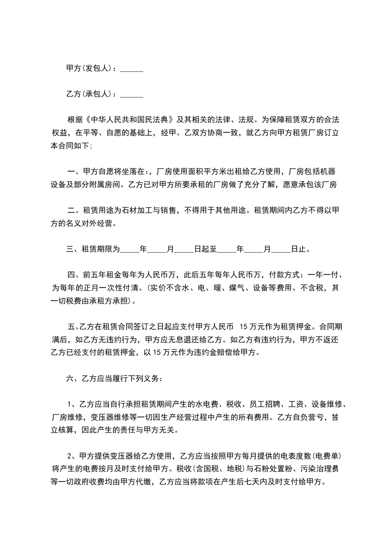 一、甲方自愿将坐落在:,厂房使用面积平方米出租给乙方使用,厂房包括机器设备及部分附属房间。乙方已对甲方所要承租的厂房做了充分了解,愿意承包该厂房。