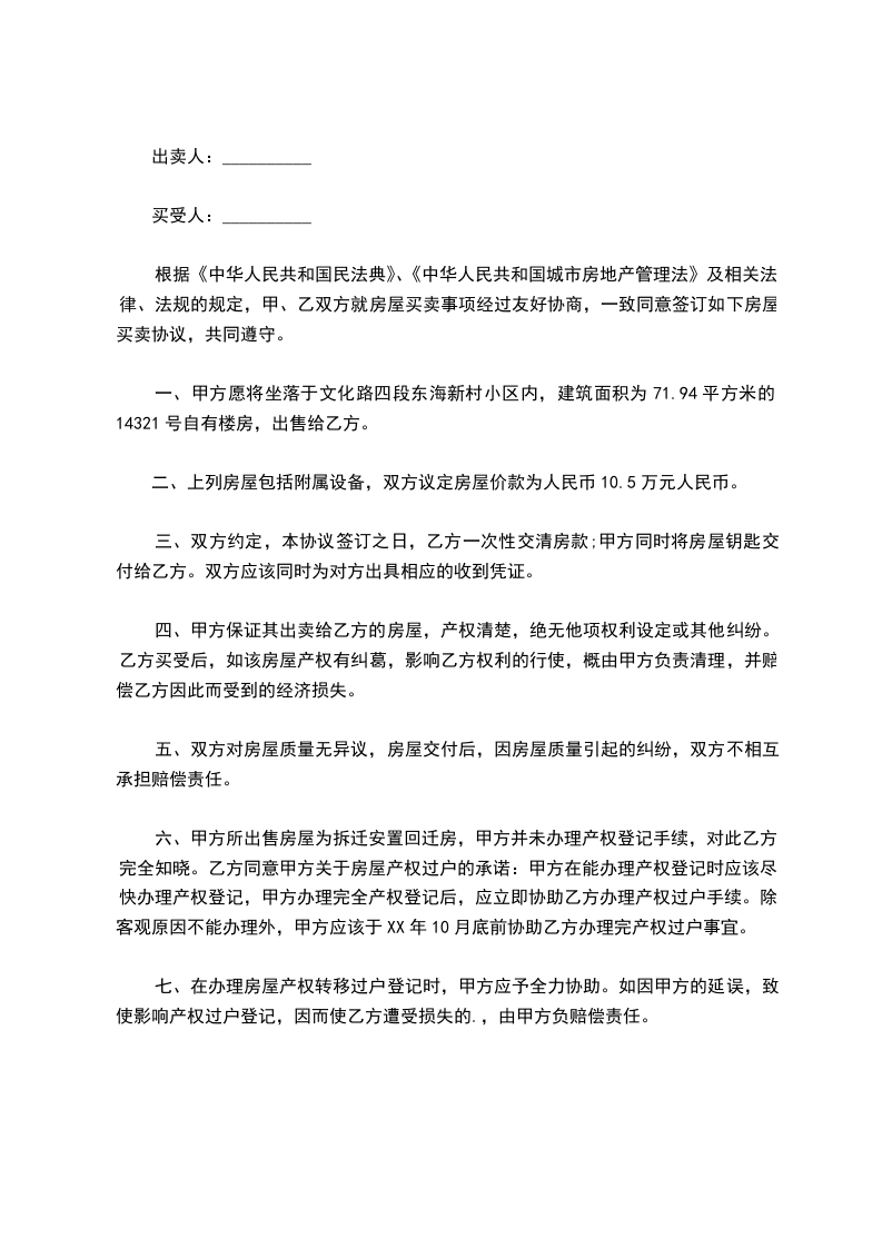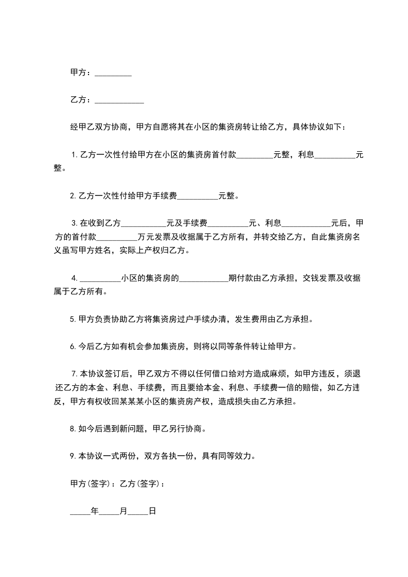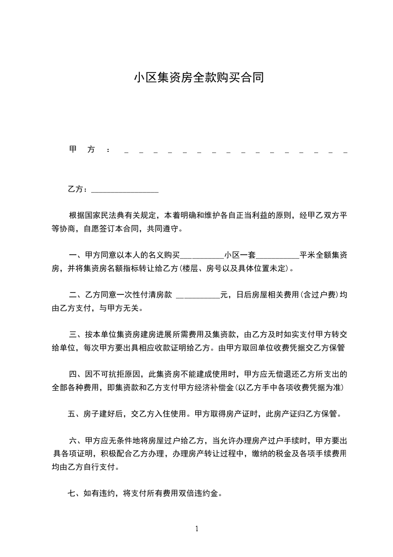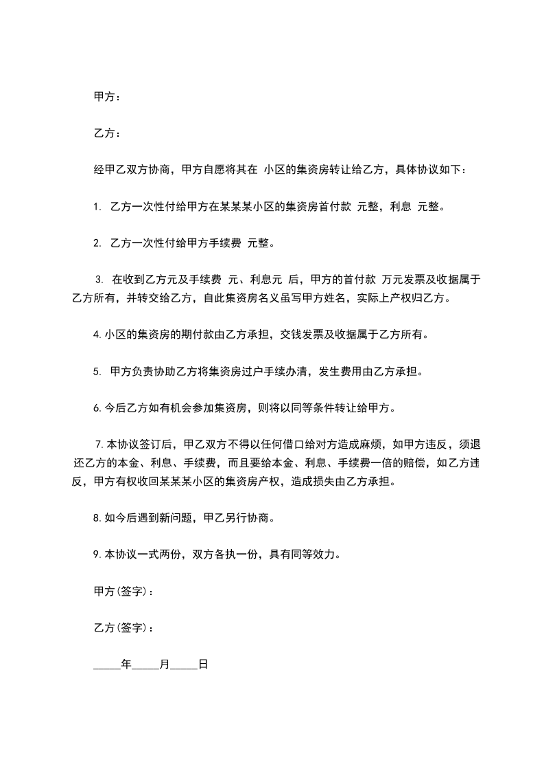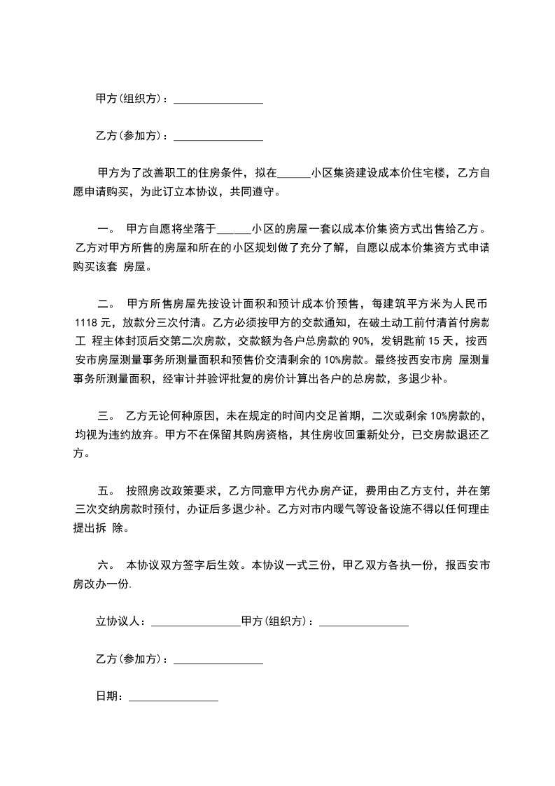 一。 甲方自愿将坐落于______小区的房屋一套以成本价集资方式出售给乙方。乙方对甲方所售的房屋和所在的小区规划做了充分了解,自愿以成本价集资方式申请购买该套 房屋。