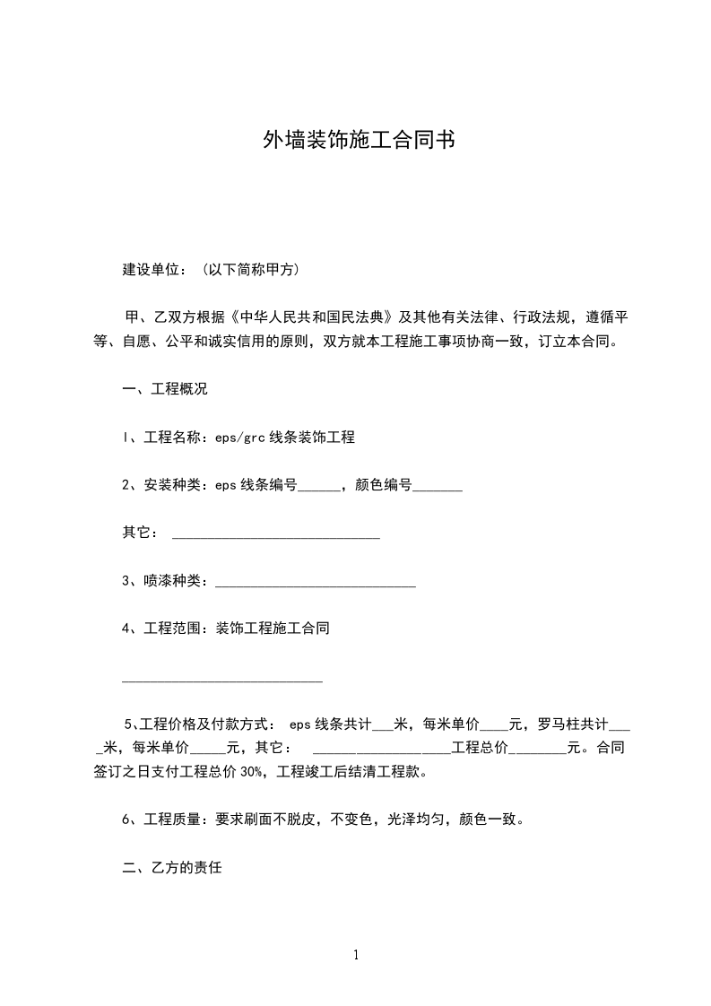 5、工程价格及付款方式:eps线条共计___米,每米单价____元,罗马柱共计____米,每米单价_____元,其它: ___________________工程总价________元。合同签订之日支付工程总价30%,工程竣工后结清工程款。