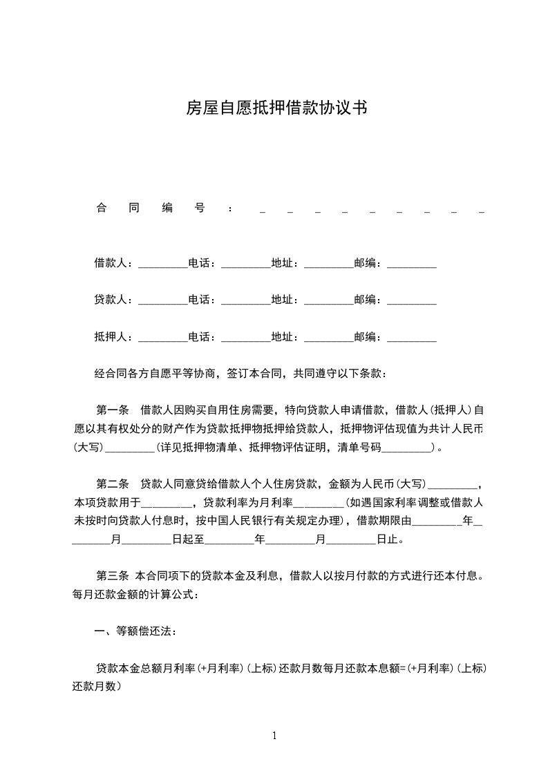 第一条 借款人因购买自用住房需要,特向贷款人申请借款,借款人(抵押人)自愿以其有权处分的财产作为贷款抵押物抵押给贷款人,抵押物评估现值为共计人民币(大写)_________(详见抵押物清单、抵押物评估证明,清单号码_________)。