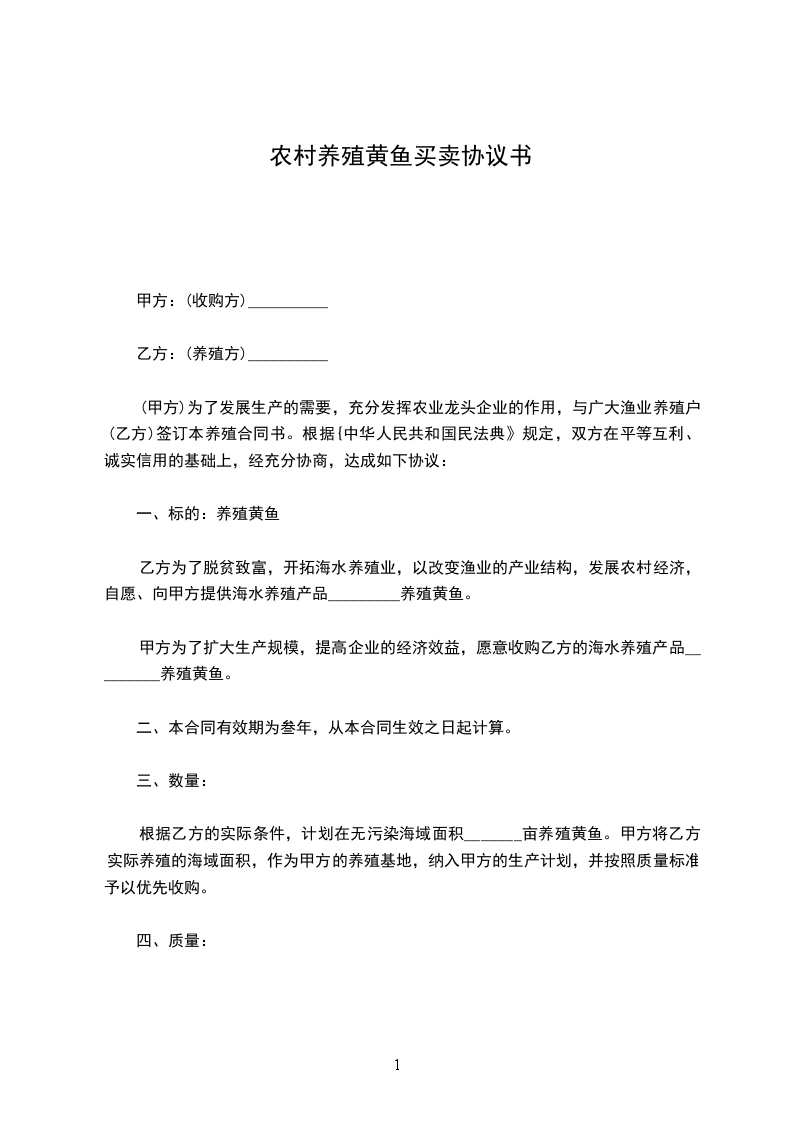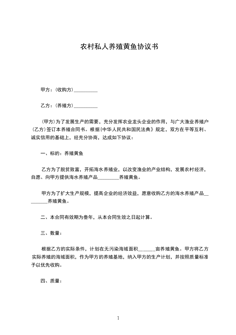 (甲方)为了发展生产的需要,充分发挥农业龙头企业的作用,与广大渔业养殖户(乙方)签订本养殖合同书。根据{中华人民共和国民法典》规定,双方在平等互利、诚实信用的基础上,经充分协商,达成如下协议: