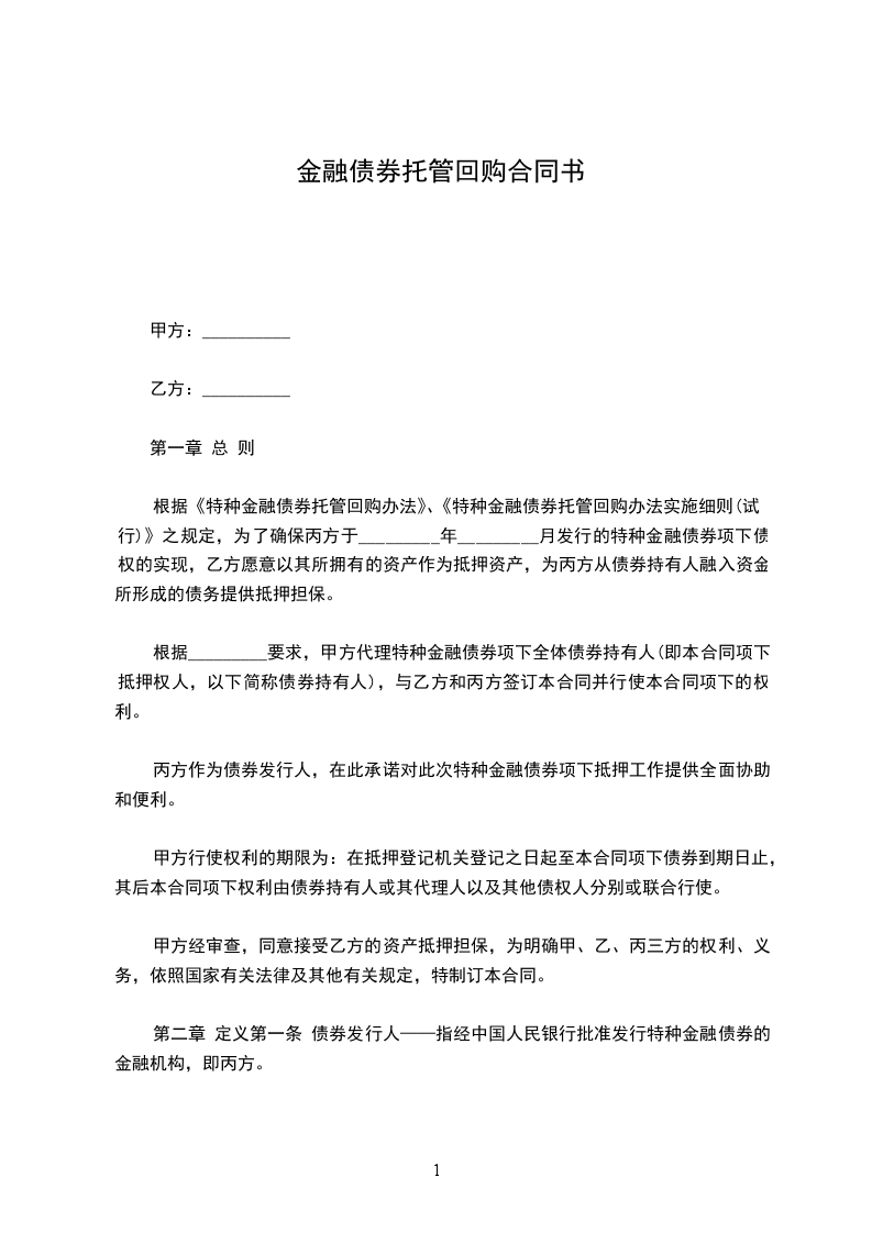 第二条 特种金融债券——指经中国人民银行批准,丙方发行的专门用于清偿证券回购债务的有价证券。