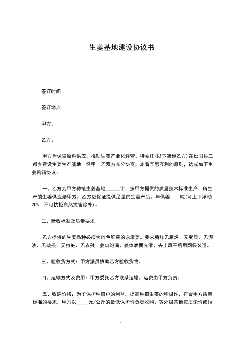 甲方为保障原料供应,推动生姜产业化经营。特委托(以下简称乙方)在松阳县三都乡建设生姜生产基地。经甲、乙双方充分协商,本着互惠互利的原则,达成如下生姜购销协议: