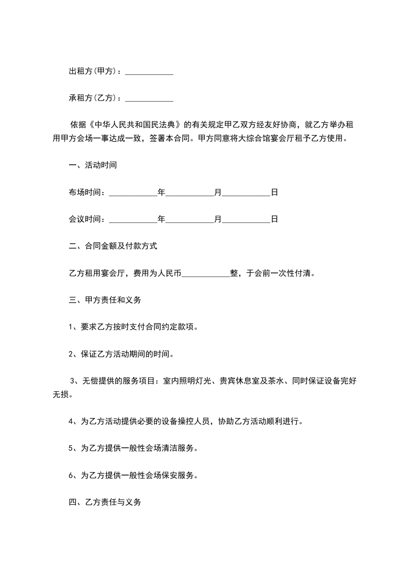 依据《中华人民共和国民法典》的有关规定甲乙双方经友好协商,就乙方举办租用甲方会场一事达成一致,签署本合同。甲方同意将大综合馆宴会厅租予乙方使用。