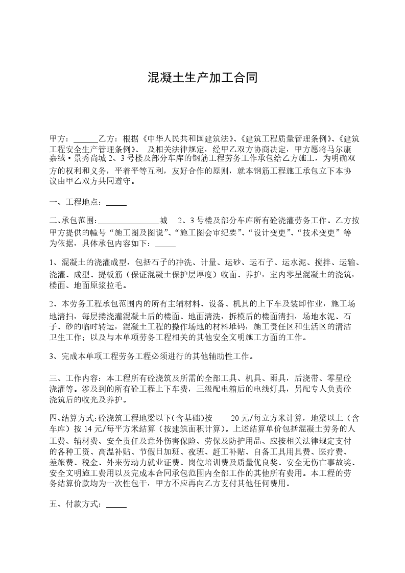 按上述承包内容,采取按实际建筑面积计算,每平方以________元计价付款,施工期间,乙方每完成一层主体工程,预借本层建筑面积________%的工资,其余款项待该工程竣工验收合格后________月内付清。