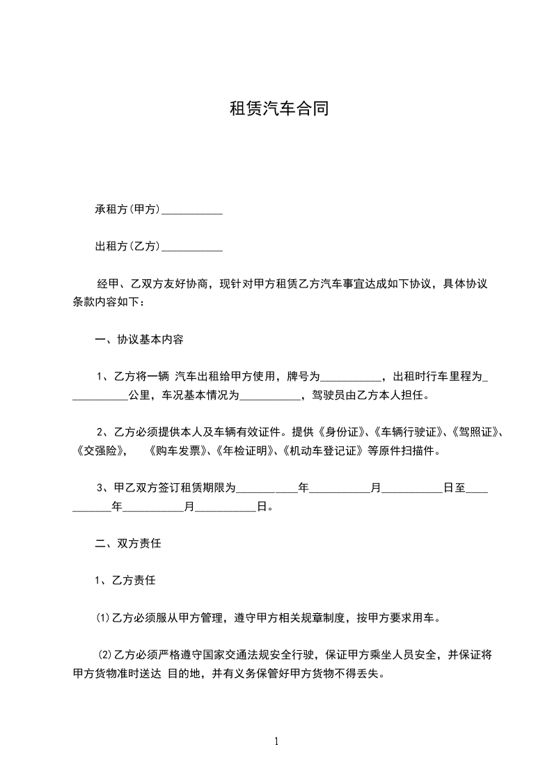 1、乙方将一辆 汽车出租给甲方使用,牌号为___________,出租时行车里程为___________公里,车况基本情况为___________,驾驶员由乙方本人担任。