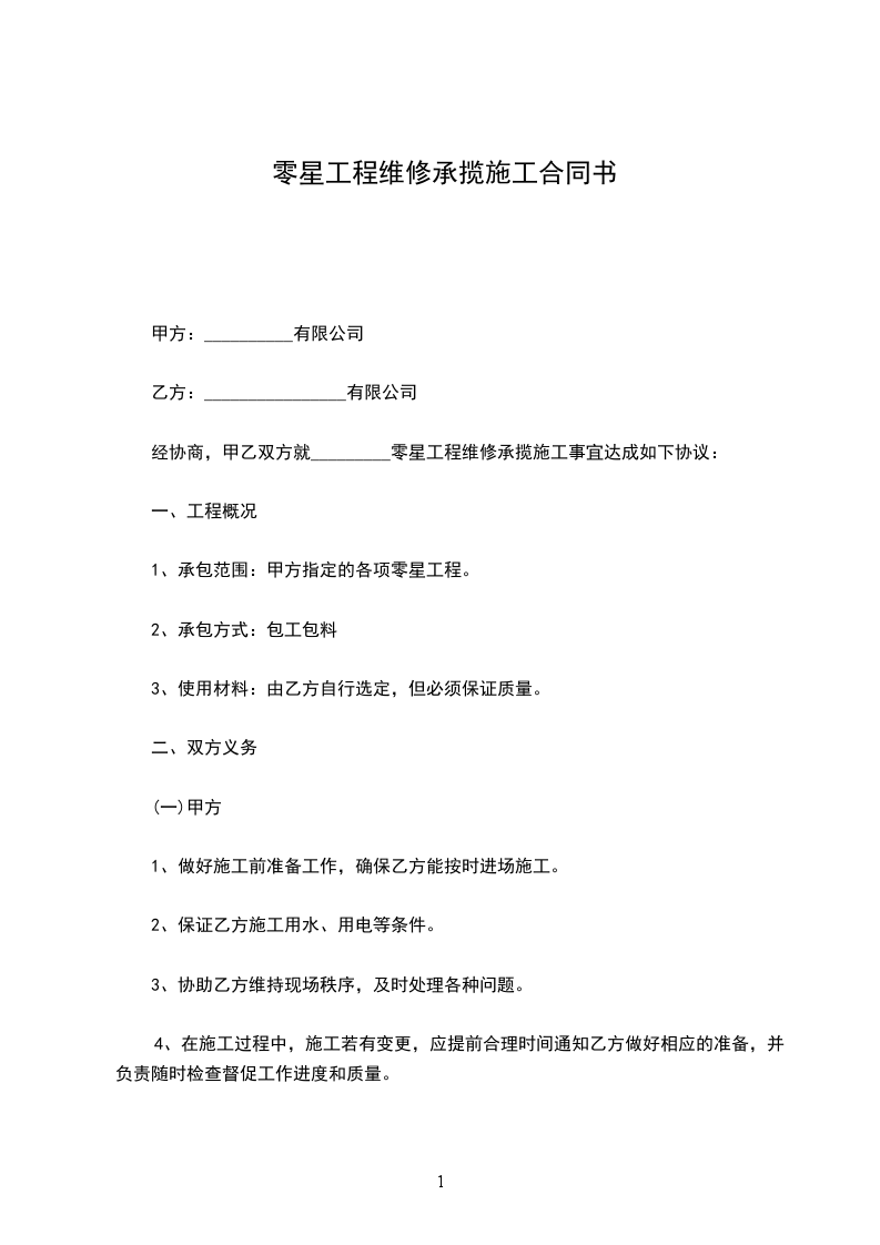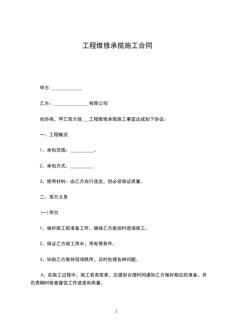 经协商,甲乙双方就___工程维修承揽施工事宜达成如下协议:
