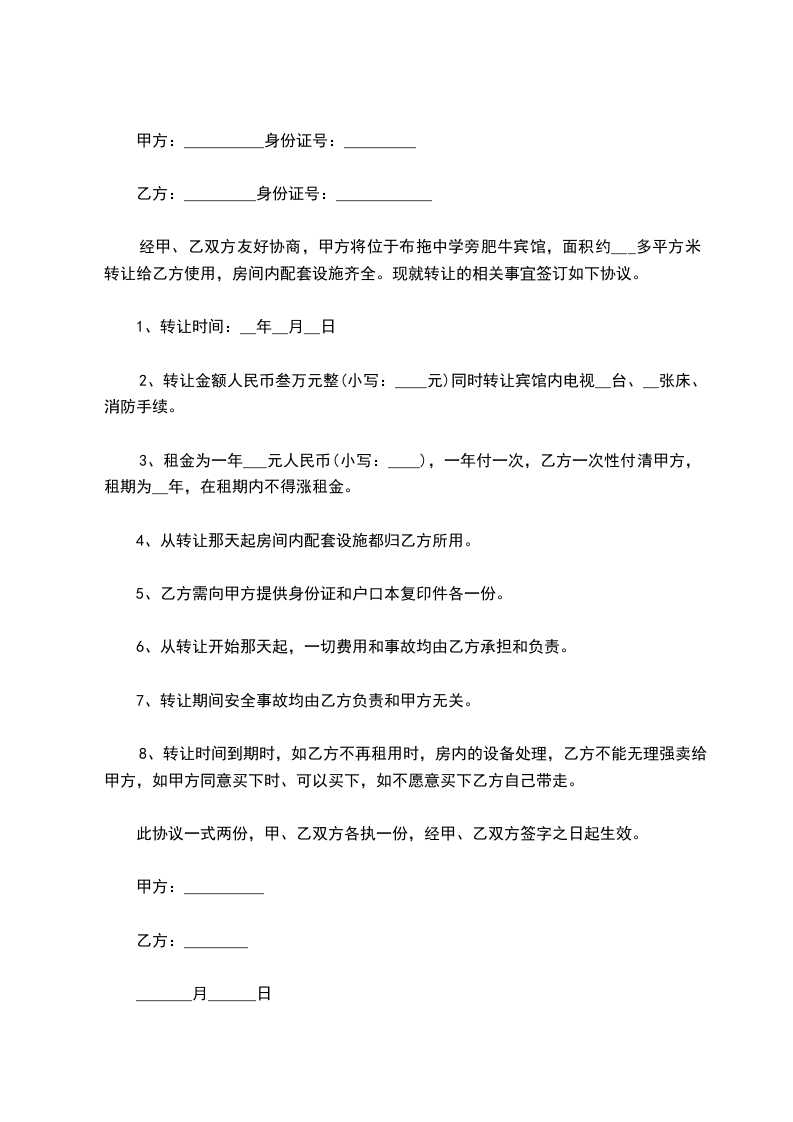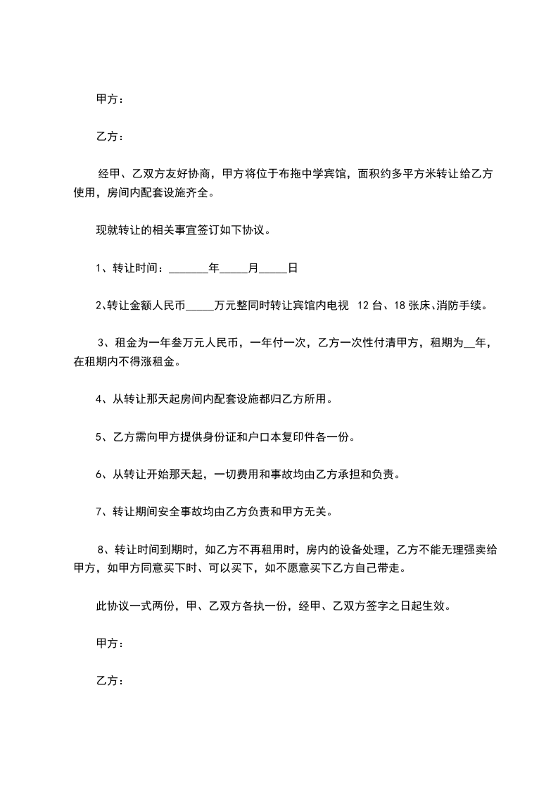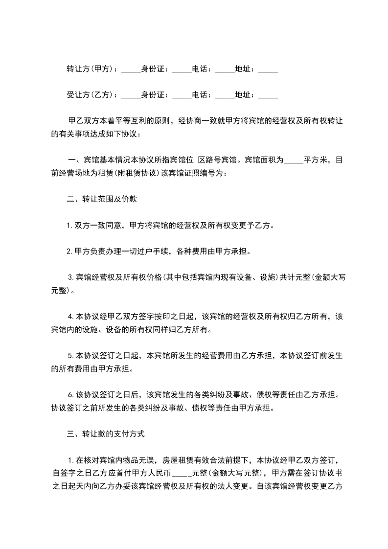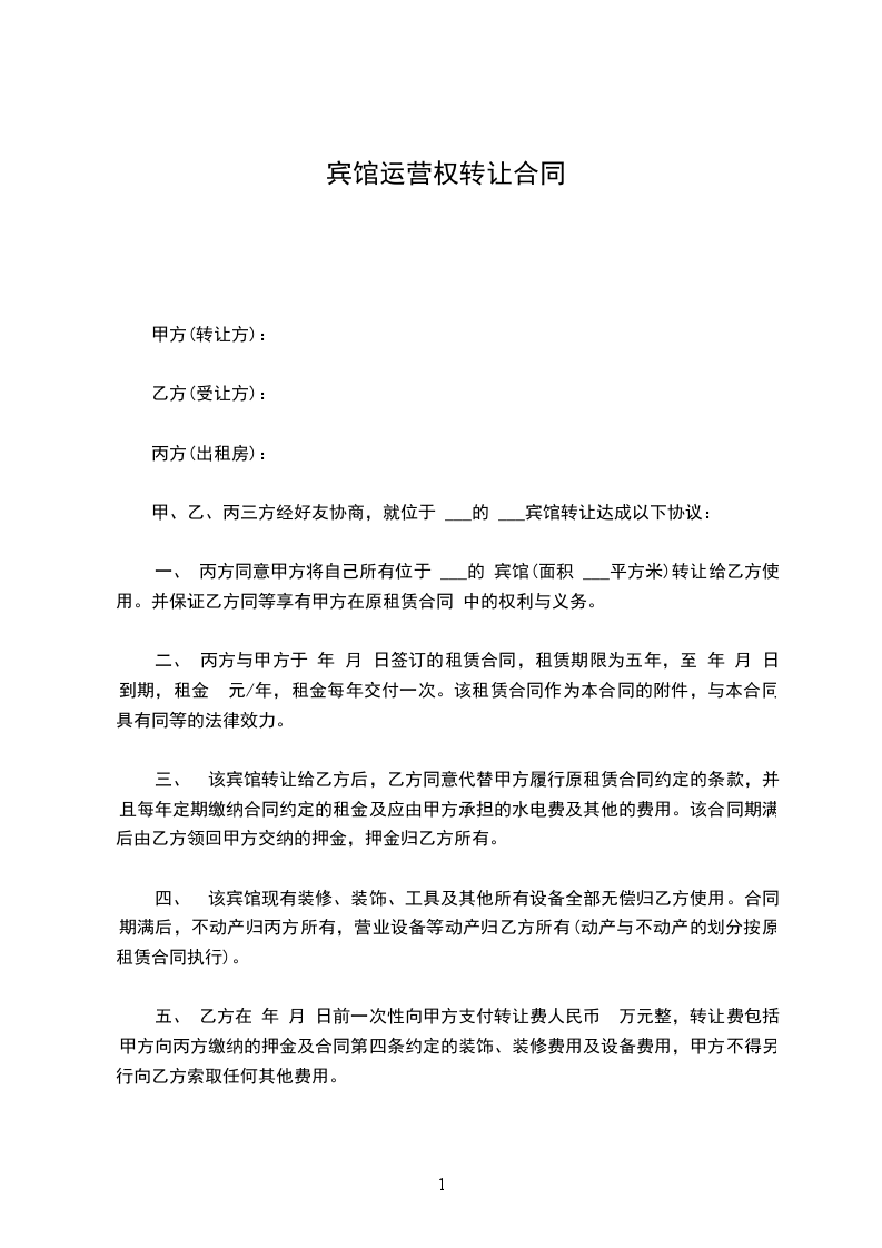 一、 丙方同意甲方将自己所有位于 ___的 宾馆(面积 ___平方米)转让给乙方使用。并保证乙方同等享有甲方在原租赁合同 中的权利与义务。