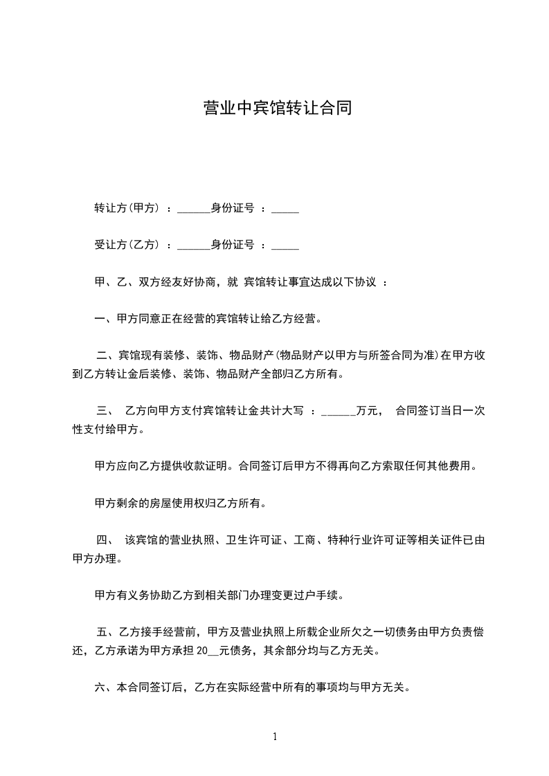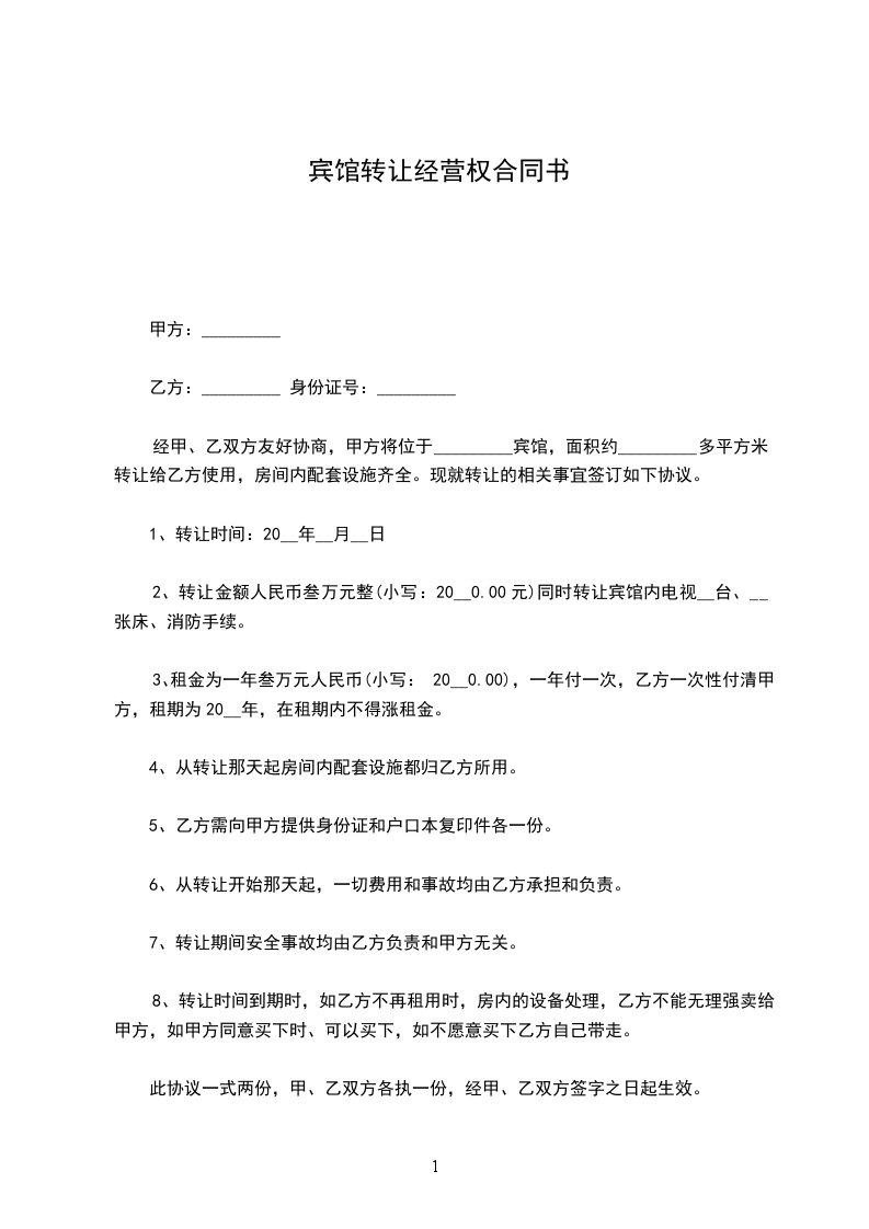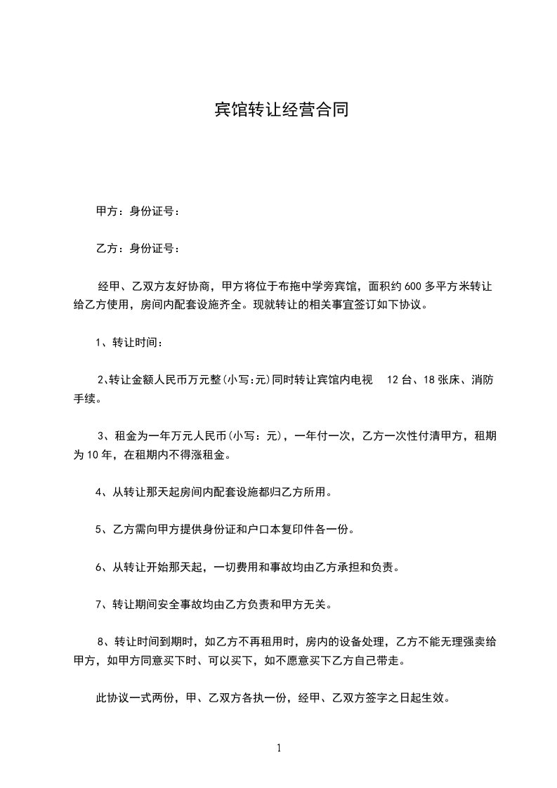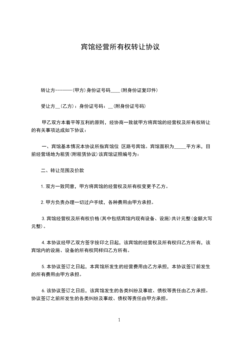 一、 丙方同意甲方将自己所有位于 ___的 宾馆(面积 ___平方米)转让给乙方使用。并保证乙方同等享有甲方在原租赁合同 中的权利与义务。