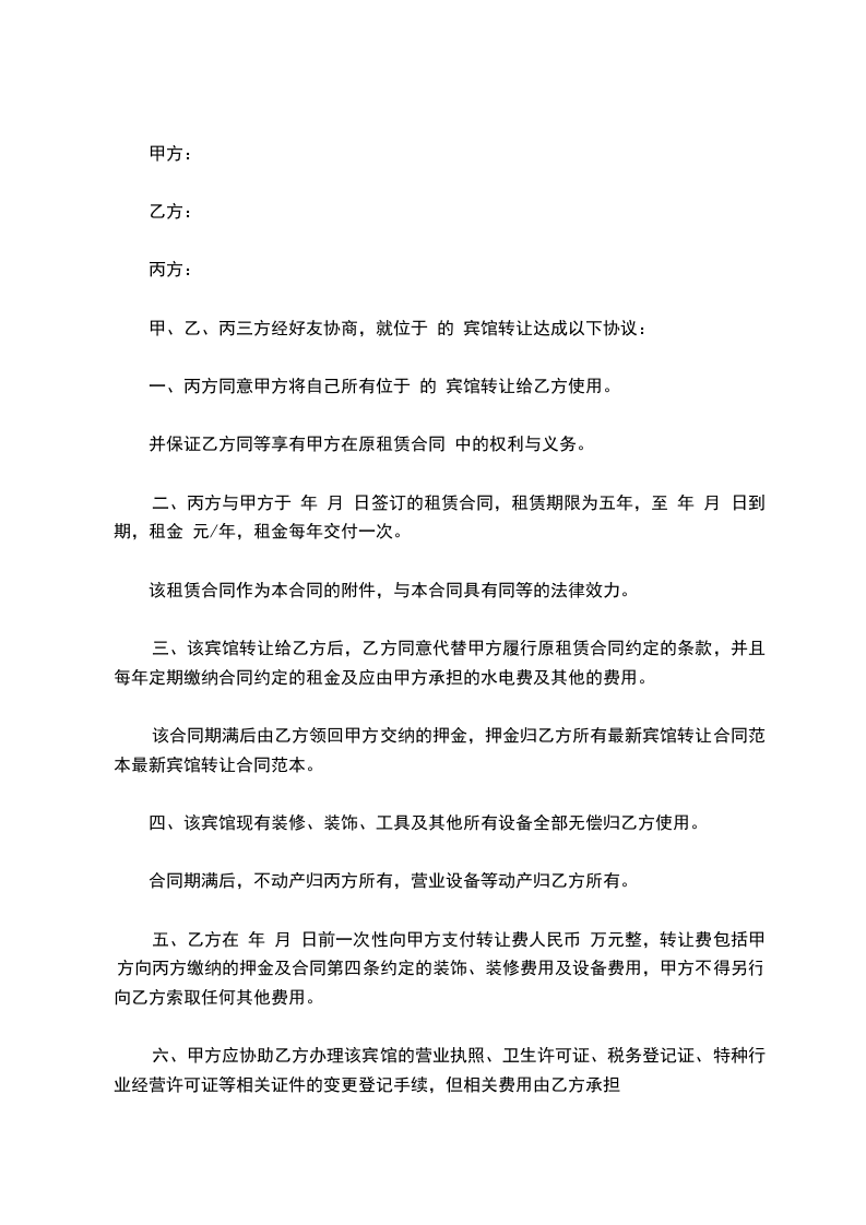 甲、乙、丙三方经好友协商,就位于 ___的 ___宾馆转让达成以下协议: