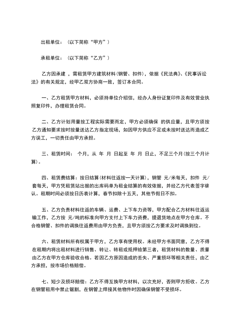 七、短少及损坏赔偿:乙方不得互换甲方材料,以次充好,否则甲方拒收。乙方在钢管租用中禁止锯割,在钢管上焊接其他物件时因确保钢管不受损坏。