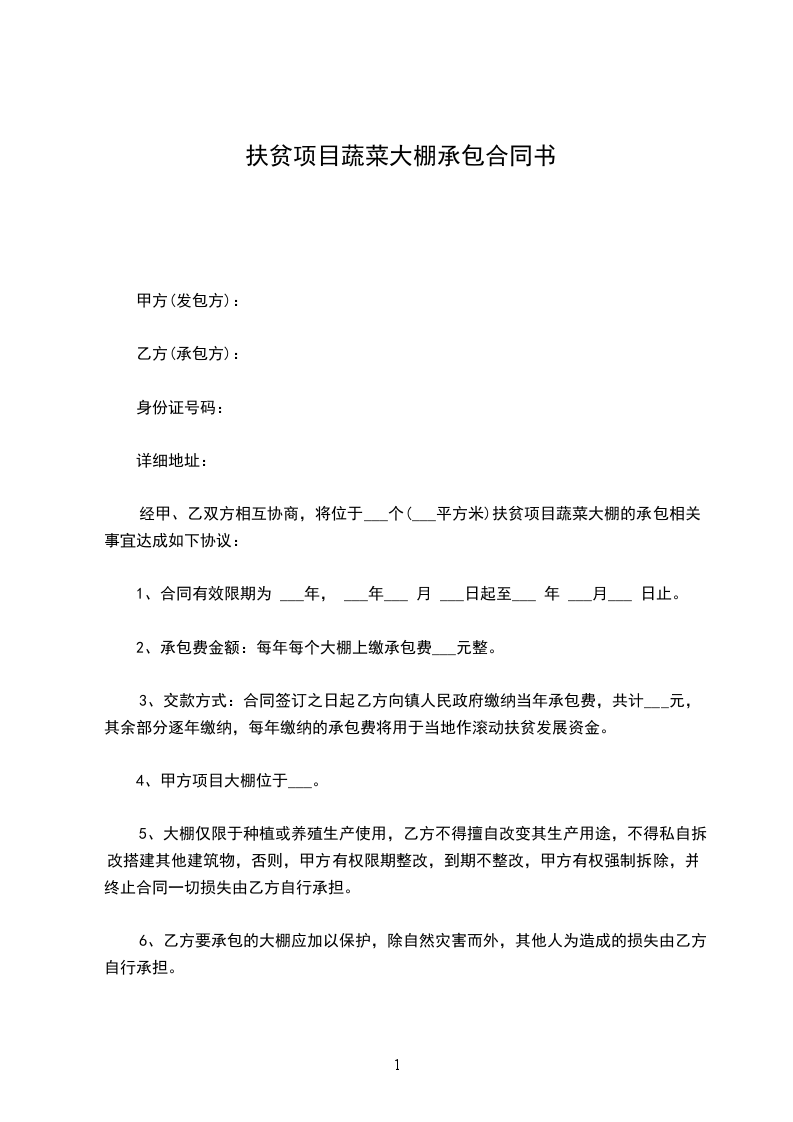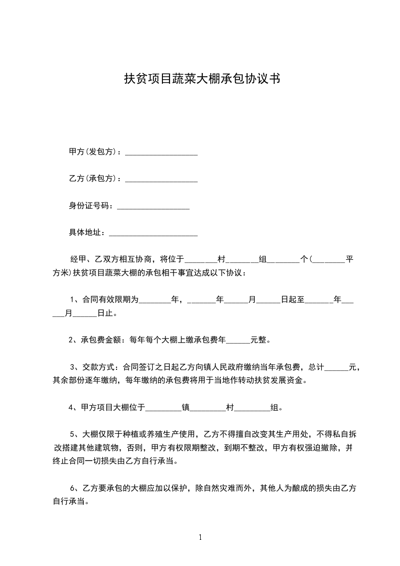 经甲、乙双方相互协商,将位于___个(___平方米)扶贫项目蔬菜大棚的承包相关事宜达成如下协议: