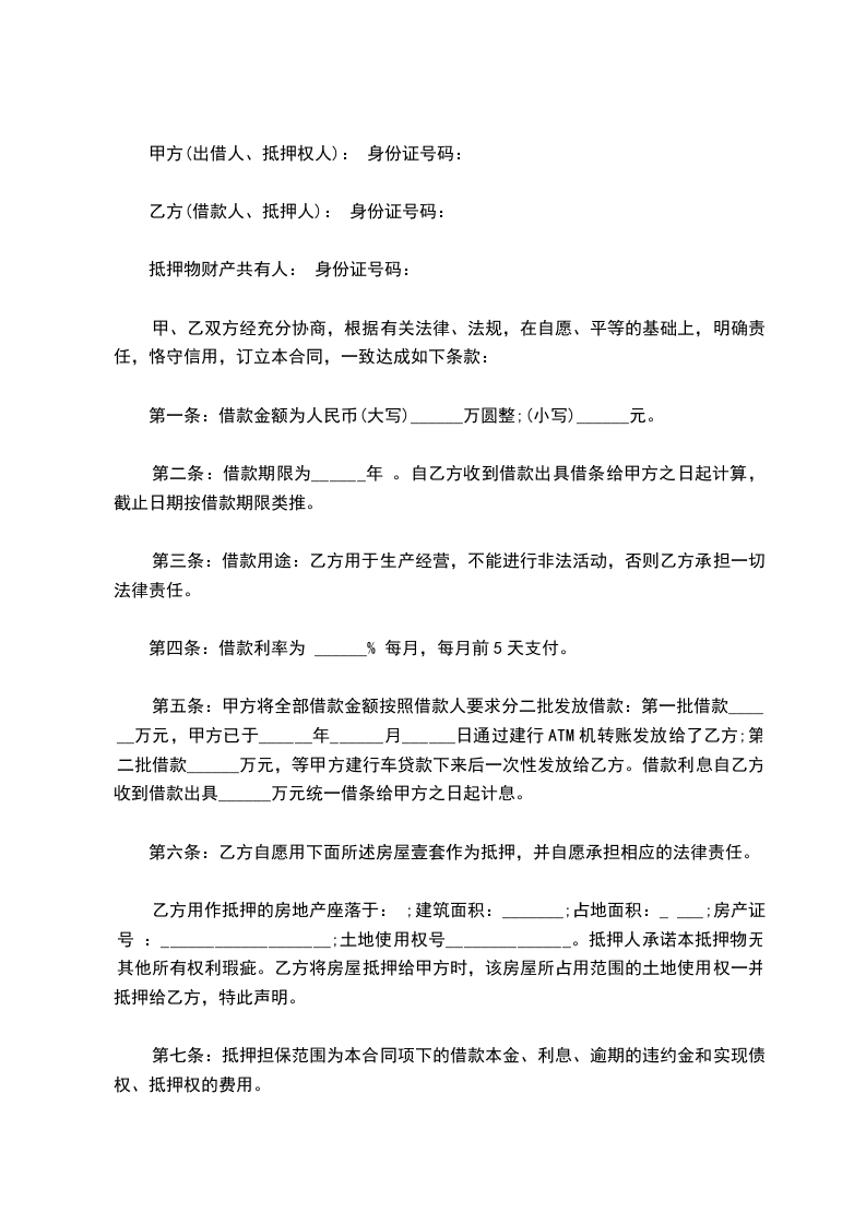 乙方用作抵押的房地产座落于: ;建筑面积:_______;占地面积:_ ___;房产证号 :___________________;土地使用权号______________。抵押人承诺本抵押物无其他所有权利瑕疵。乙方将房屋抵押给甲方时,该房屋所占用范围的土地使用权一并抵押给乙方,特此声明。