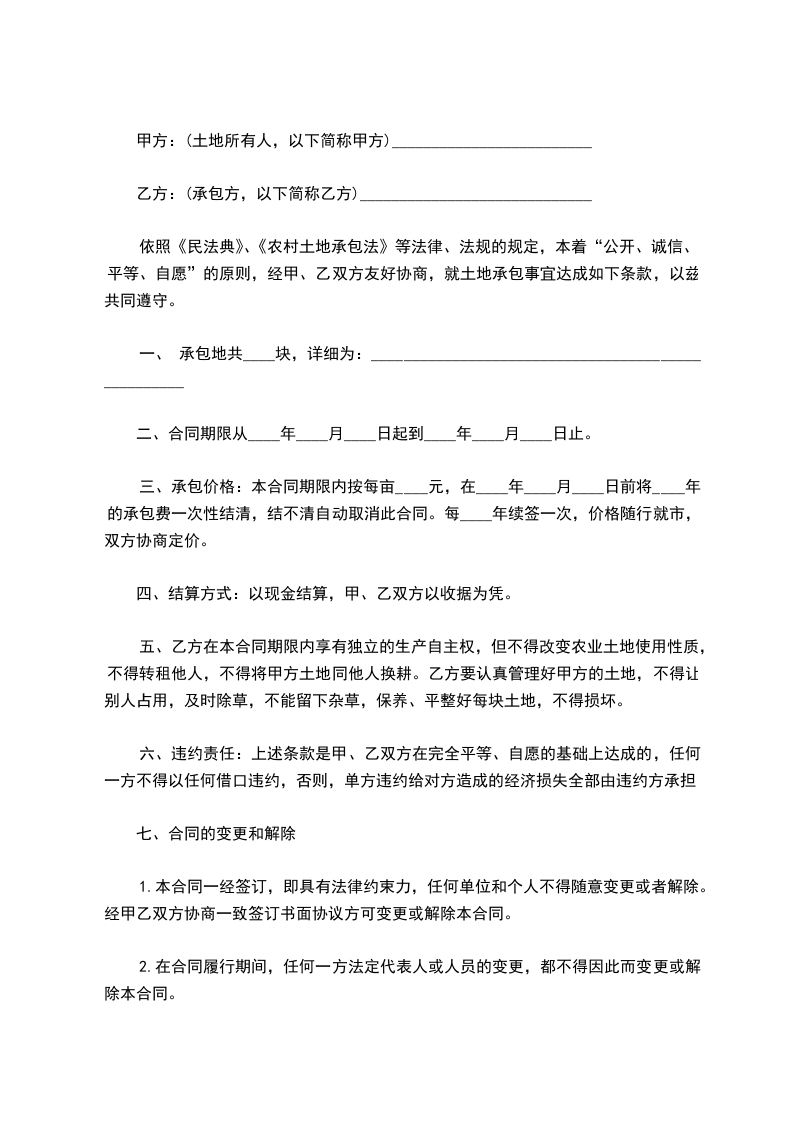 依照《民法典》、《农村土地承包法》等法律、法规的规定,本着“公开、诚信、平等、自愿”的原则,经甲、乙双方友好协商,就土地承包事宜达成如下条款,以兹共同遵守。