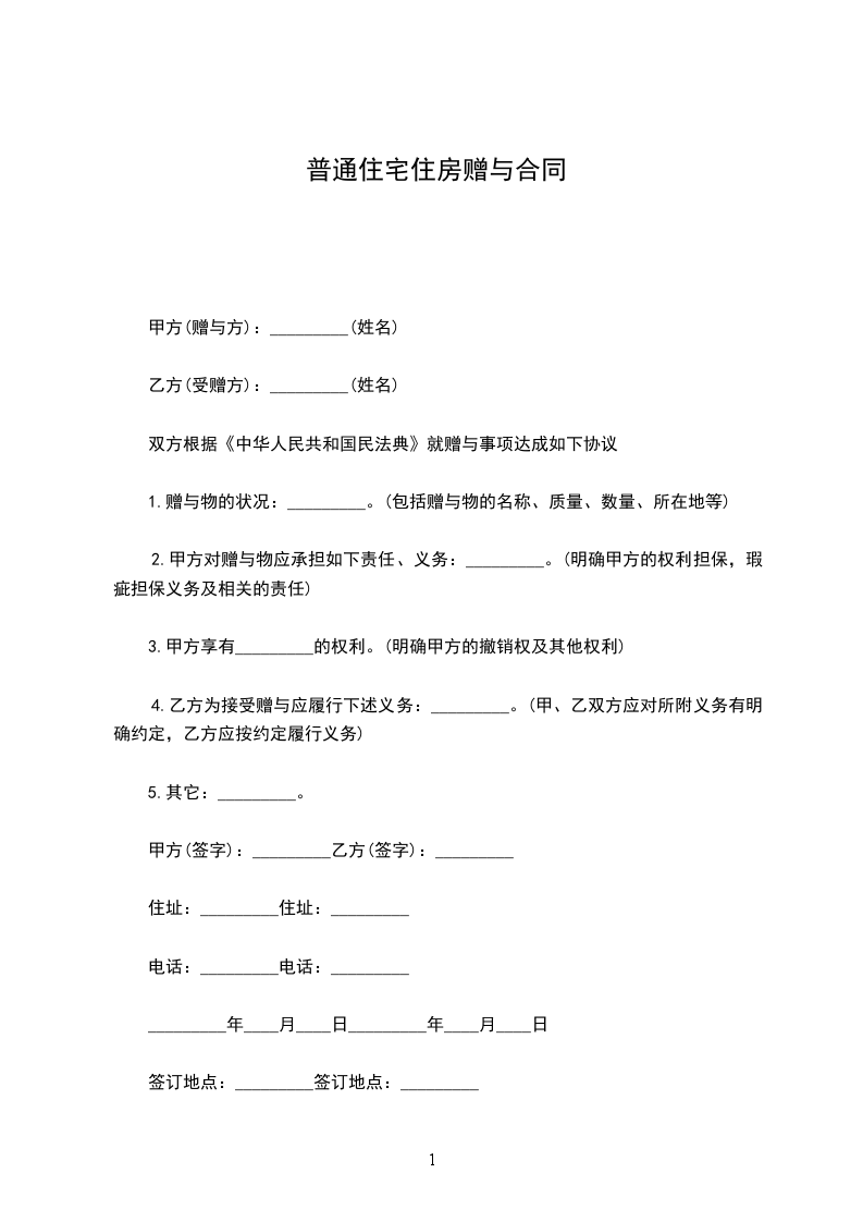 第一条 甲方决定将位于___________________________________的房屋一套,建筑面积_________平方米无偿赠与给乙方;乙方同意接受此赠与。
